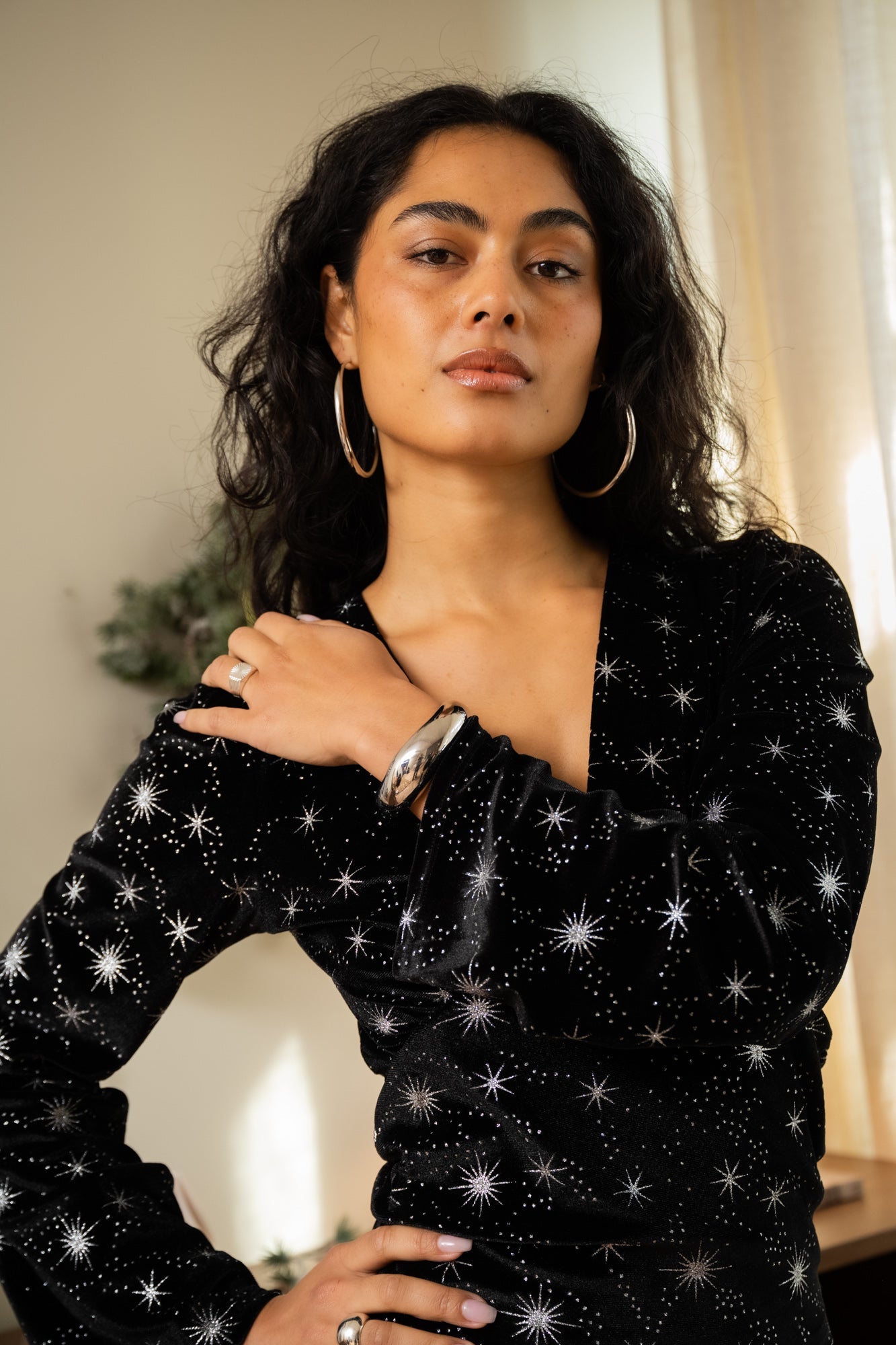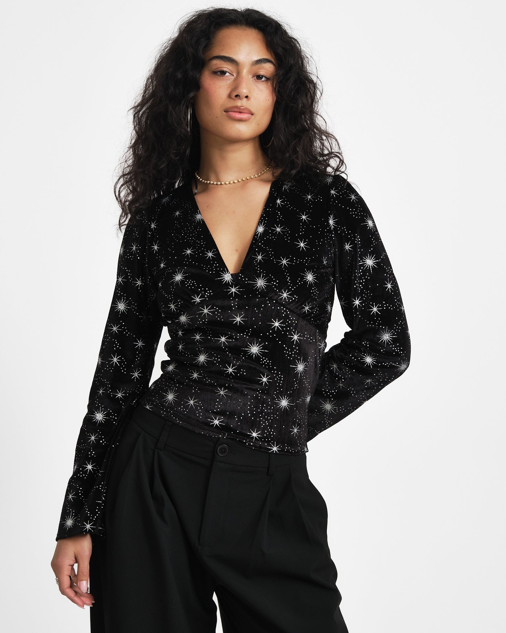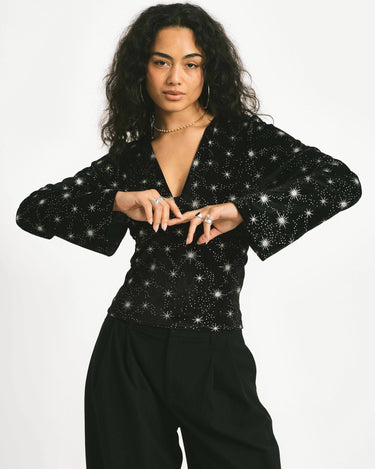Shine bright, baby! De Jella Top is gemaakt van zacht velvet met een all-over sterrenprint die meteen die cosmic vibe geeft.