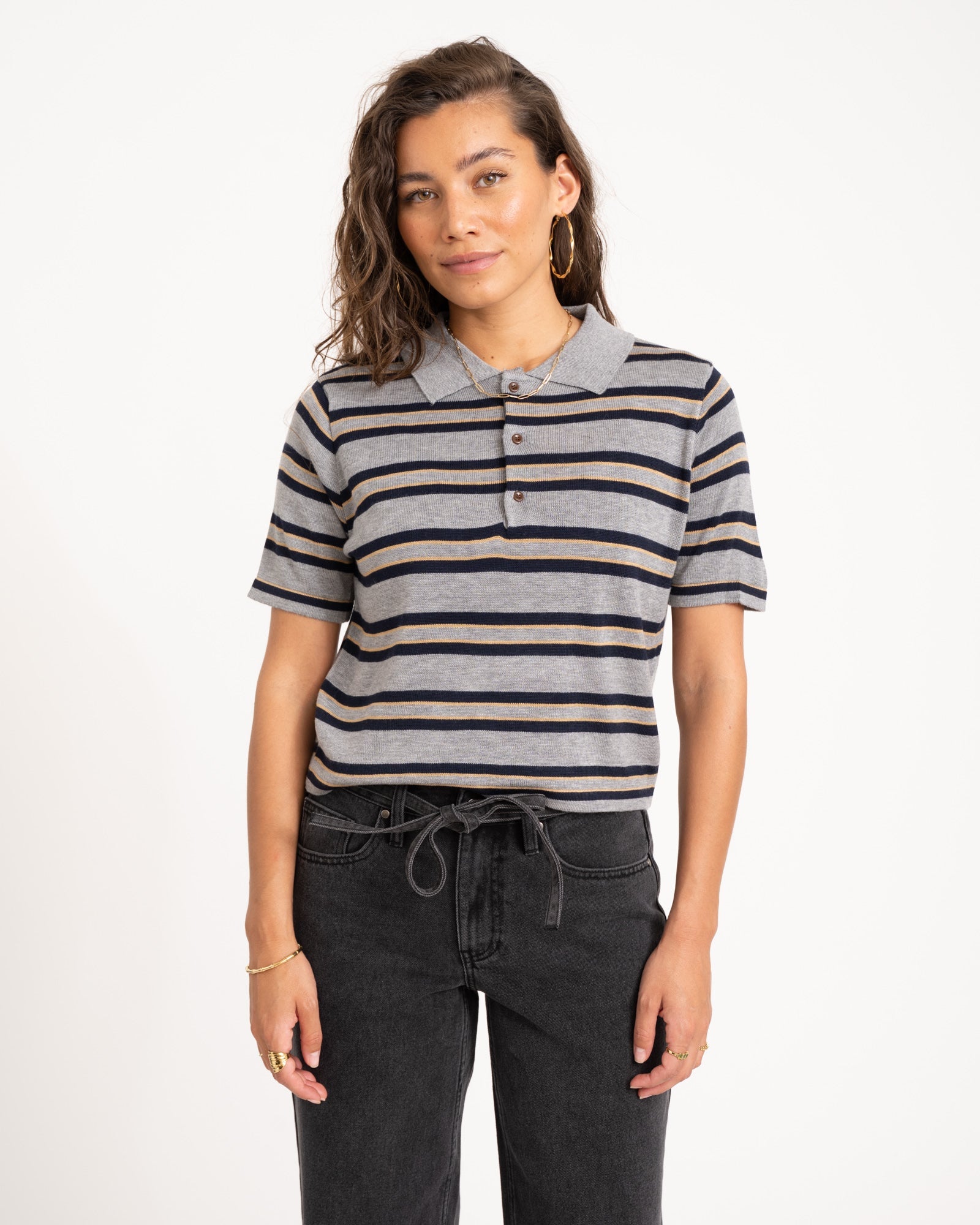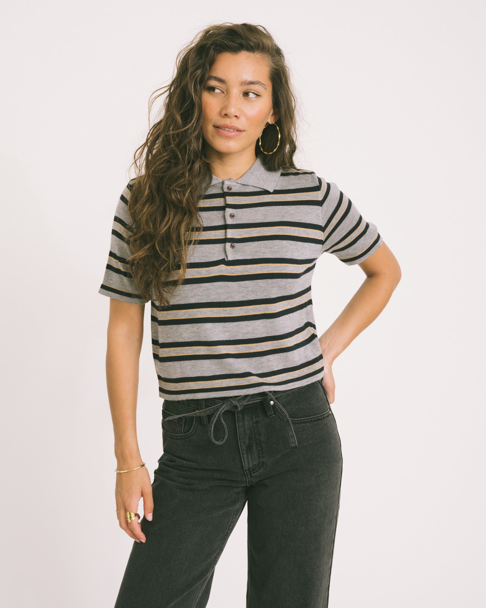 Deze donkergrijze polo met streepjes is jouw go-to voor een effortless coole look. De zachte knit, speelse knoopsluiting en relaxte fit maken ‘m perfect voor elke dag. Combineer ‘m met je favo jeans en you're good to go!