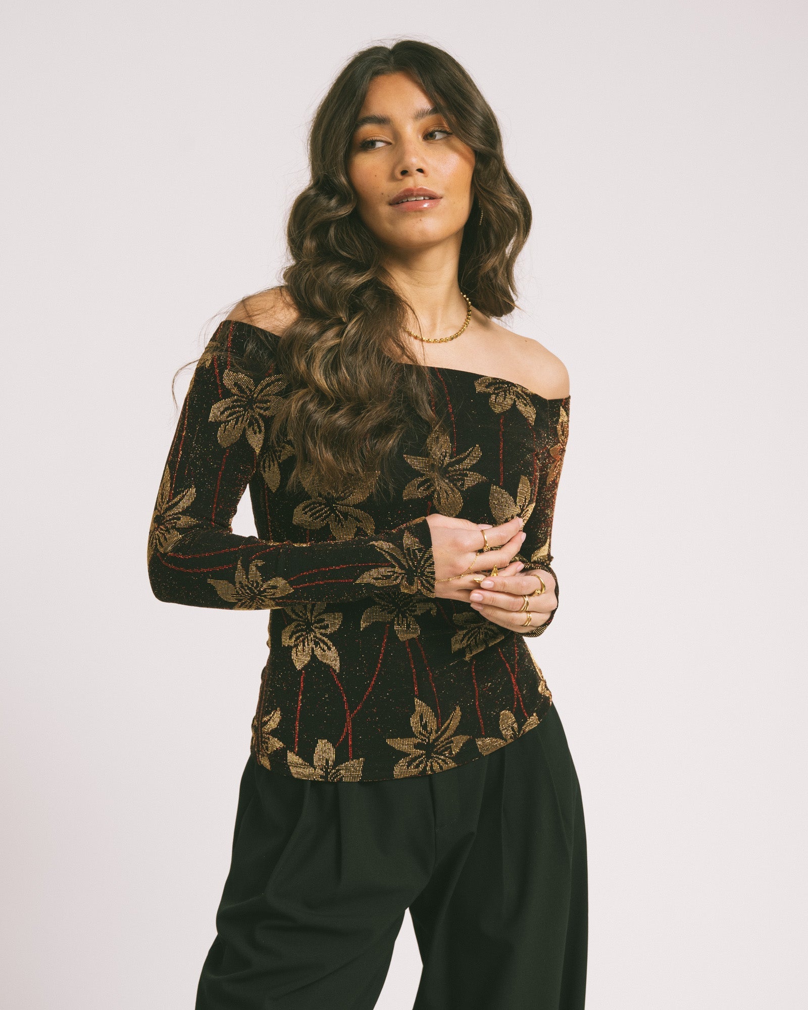 Hello party vibes! 🌺 De Kelly top is een echte eyecatcher: off-shoulder, glitter all over en een tropical flower print die je direct in de feeststemming brengt. De aangesloten fit geeft een feminine touch.