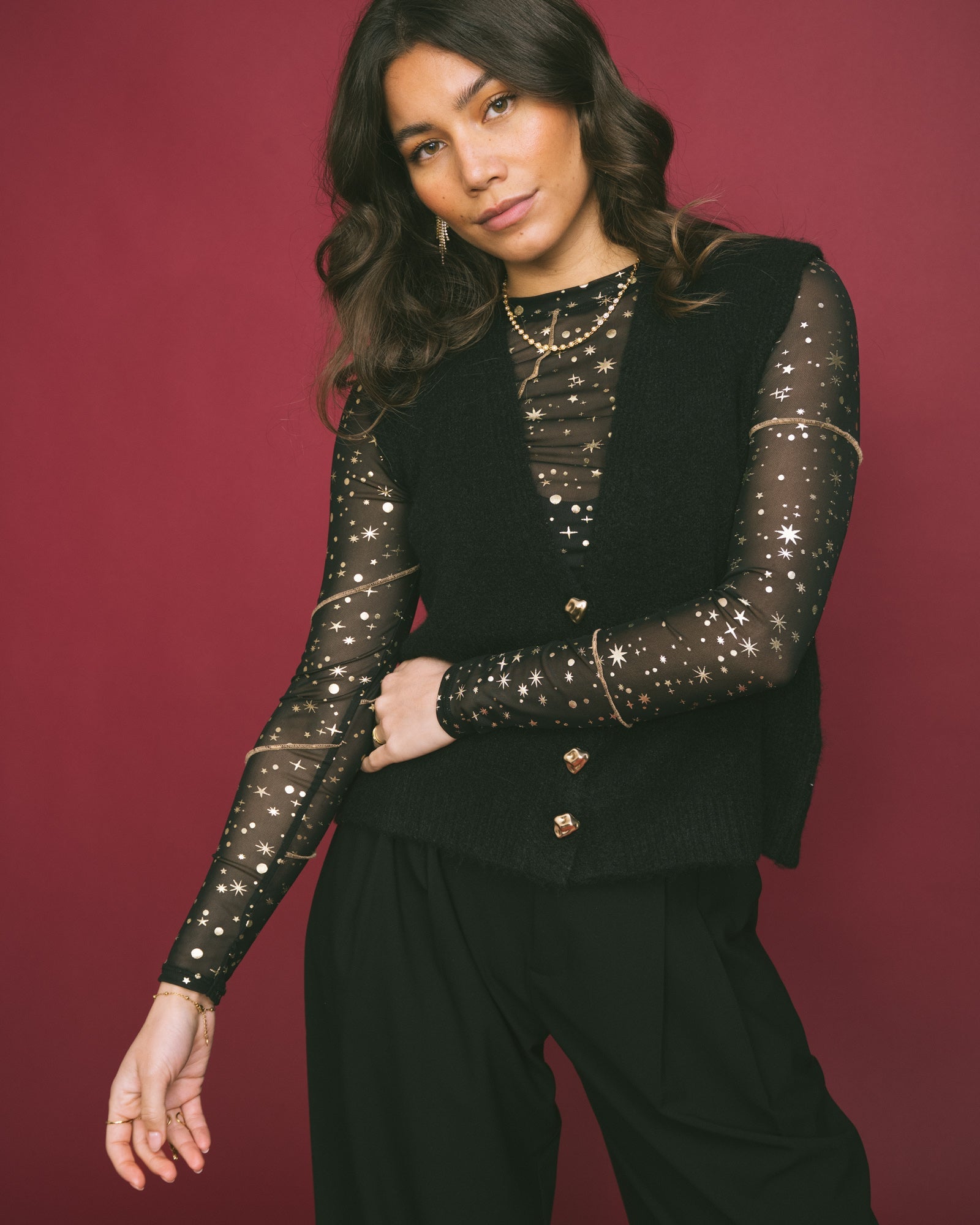 De Monica Knitted Gilet Black is het perfecte layering item voor ieder seizoen. Het zachte breisel en de relaxte fit maken ‘m super comfortabel, terwijl de gouden knopen zorgen voor een chique touch. Draag ‘m over een basic tee, longsleeve of blouse.