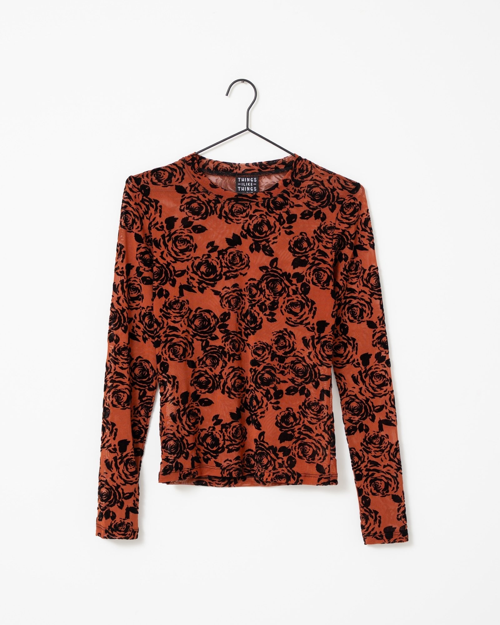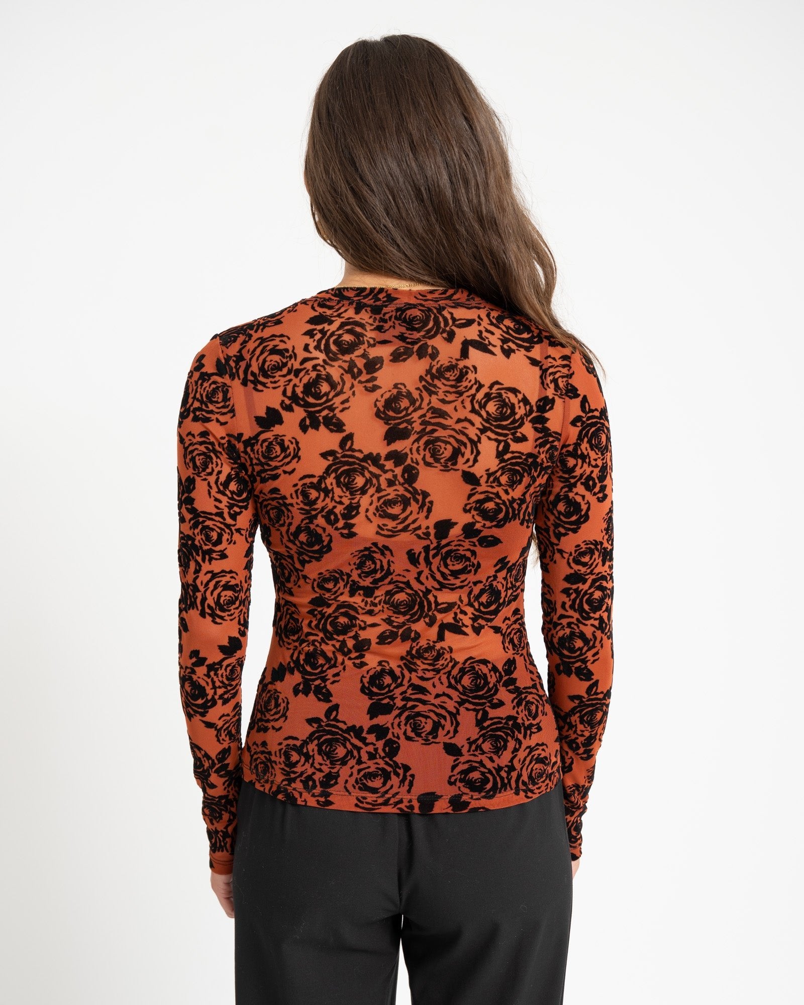 Deze top combineert sheer mesh met velvet florals in een juicy oranje tint.