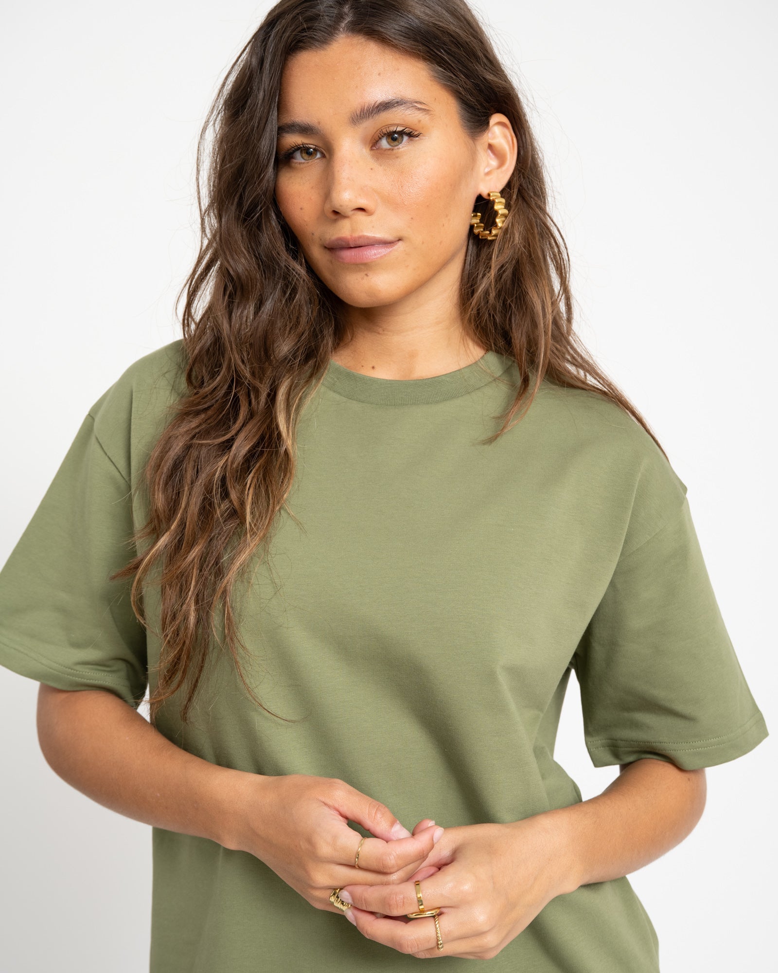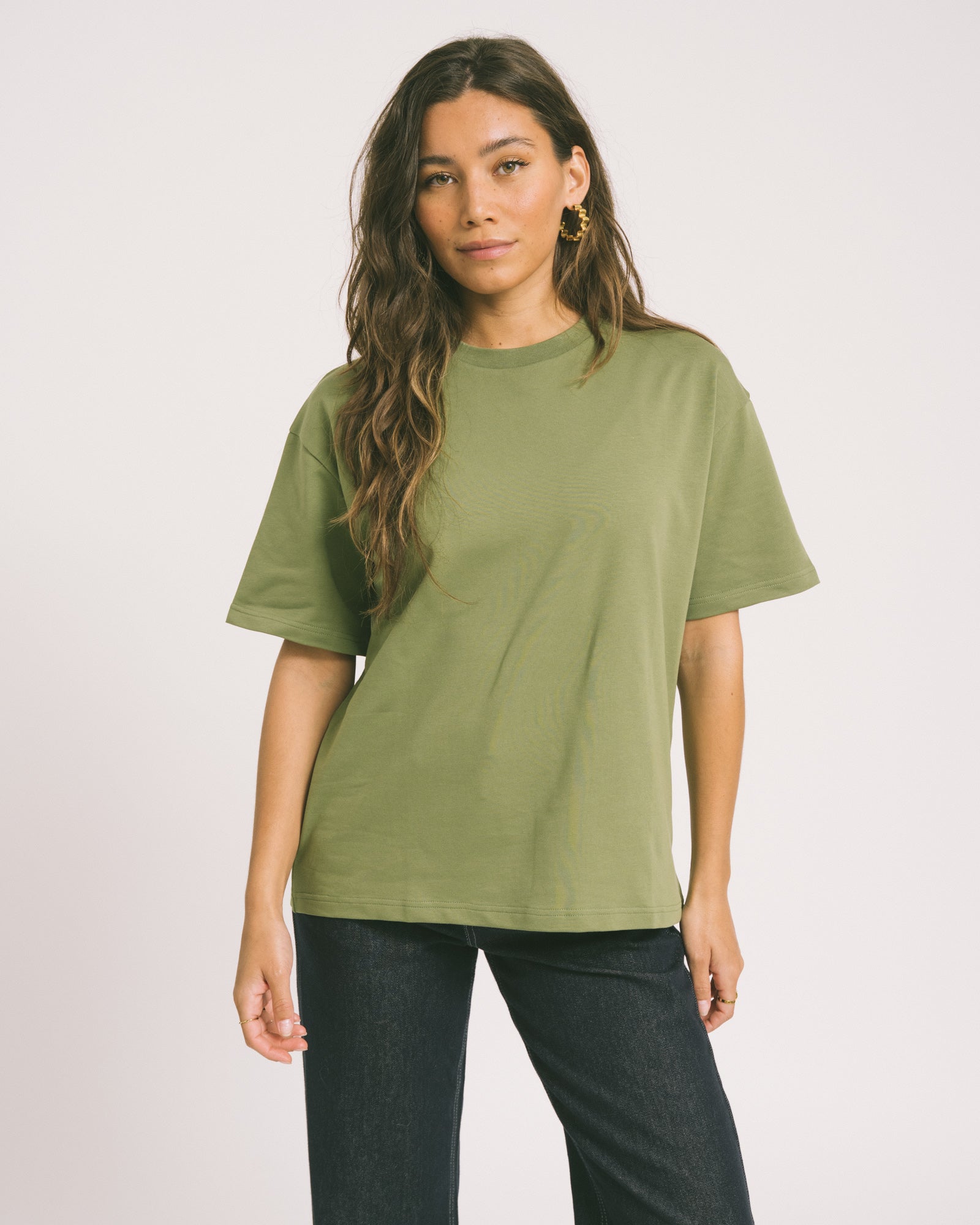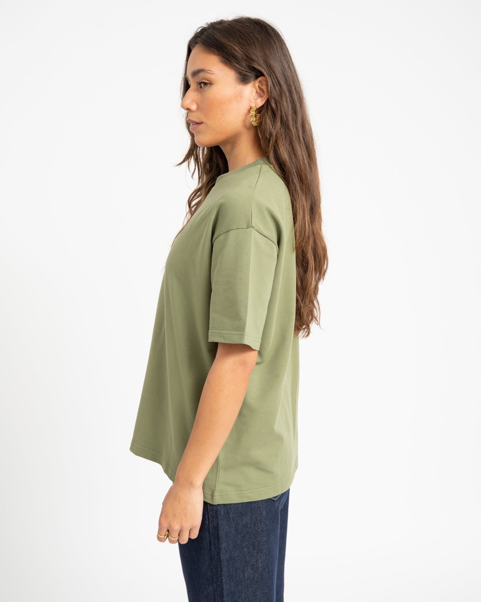 Een oversized basic tee van wat dikker katoen, waardoor het shirt zijn vorm behoudt.