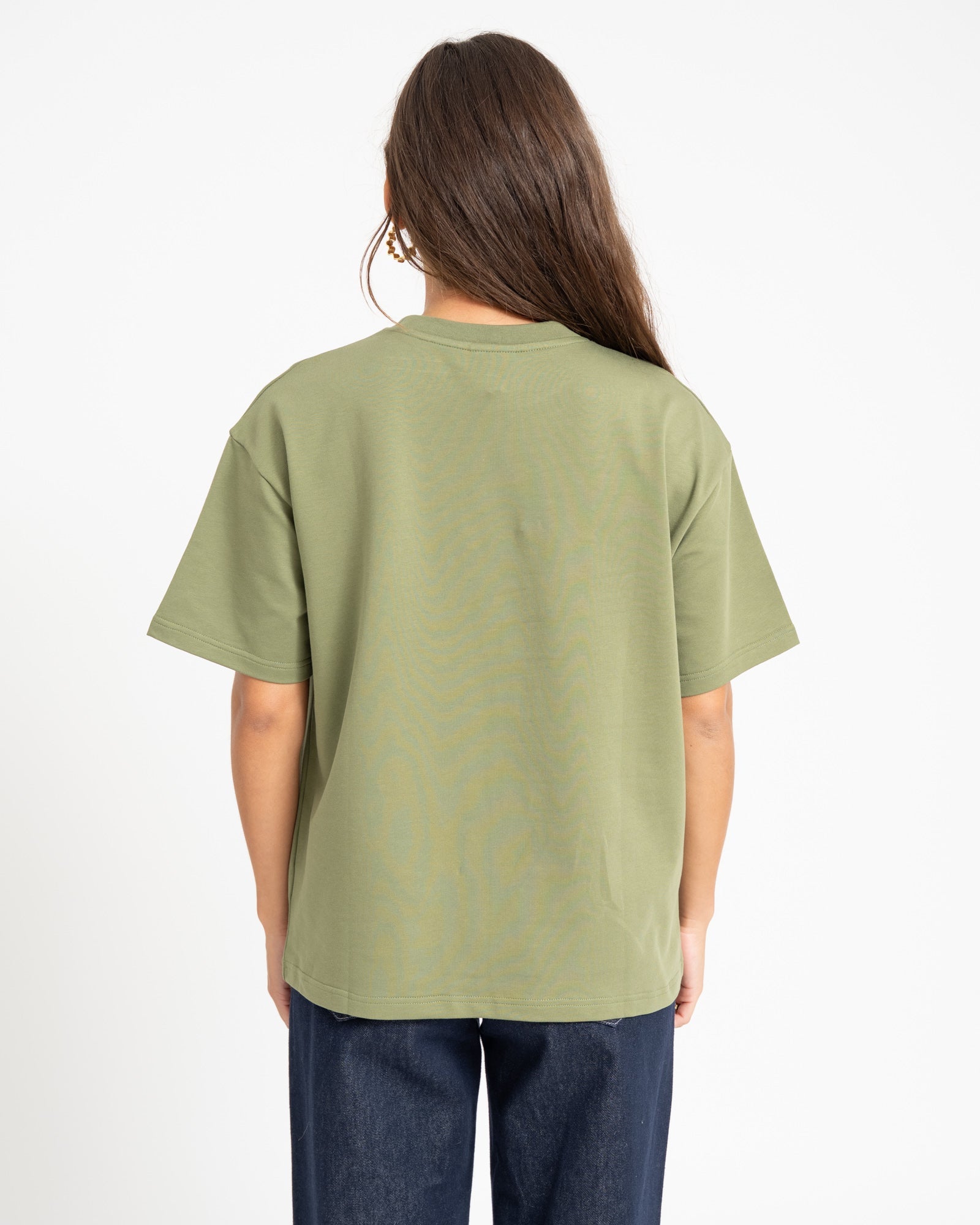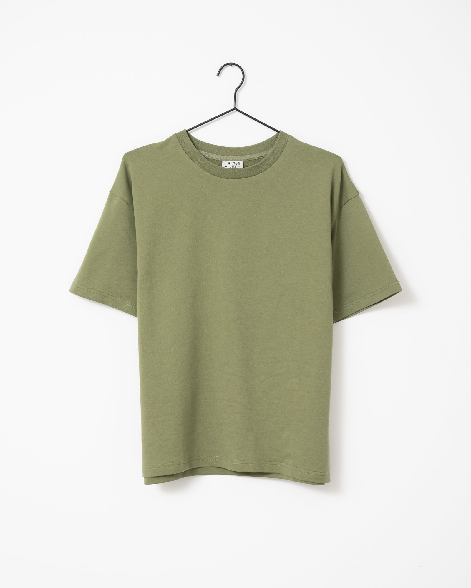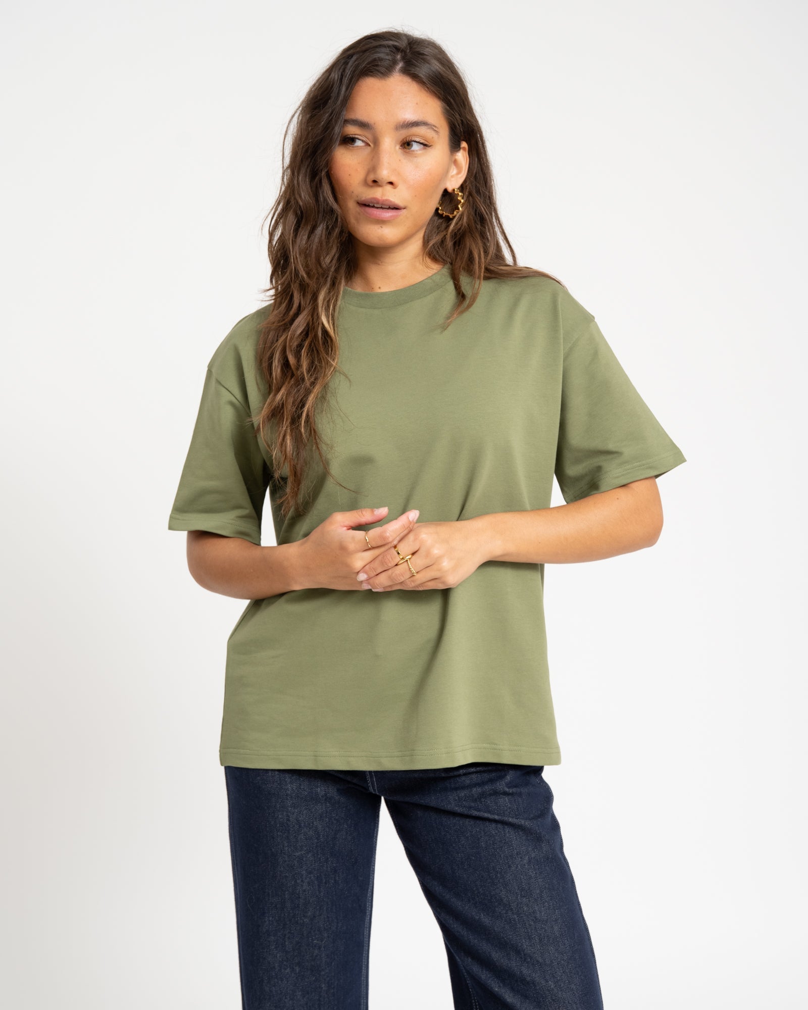 Een oversized basic tee van wat dikker katoen, waardoor het shirt zijn vorm behoudt.