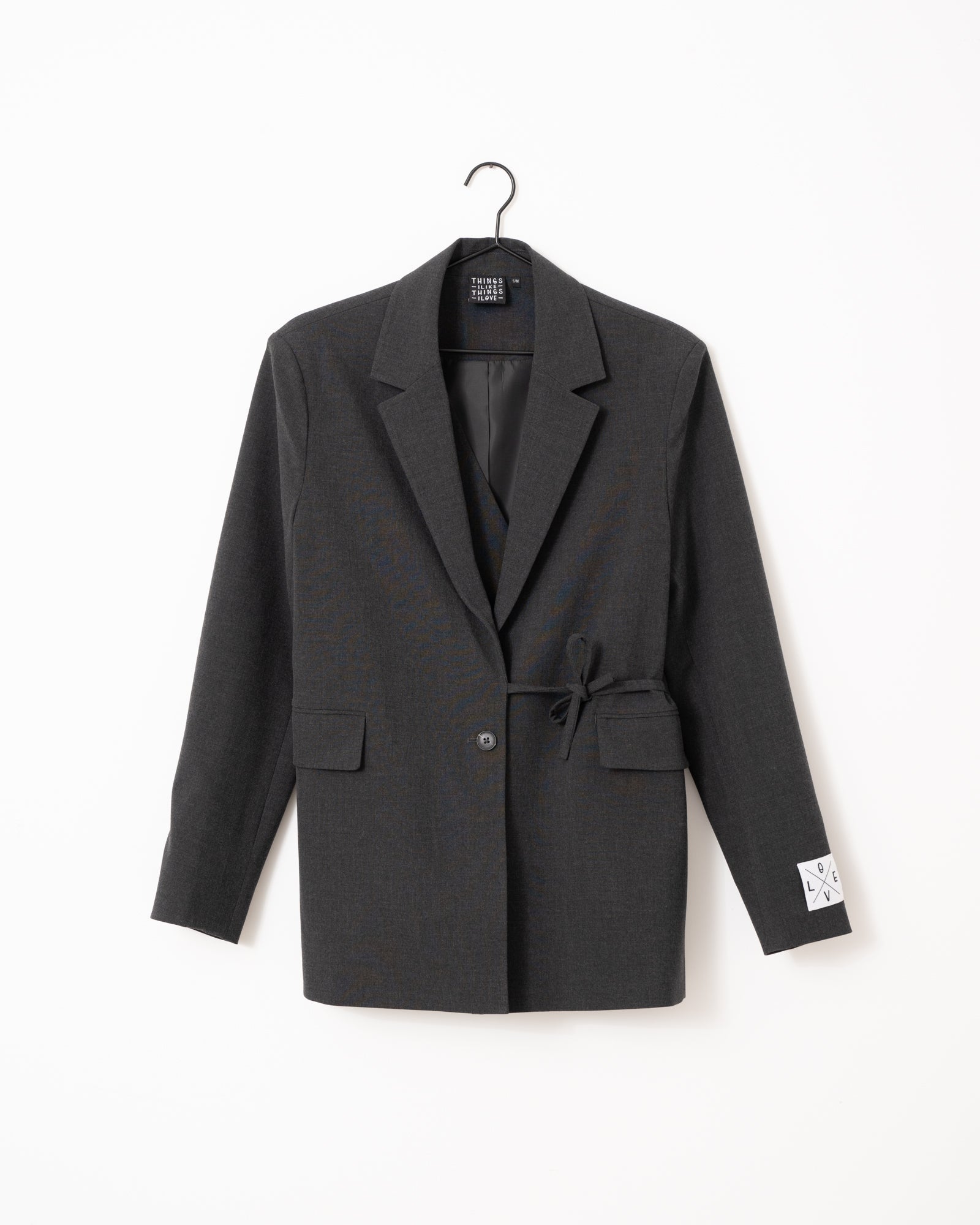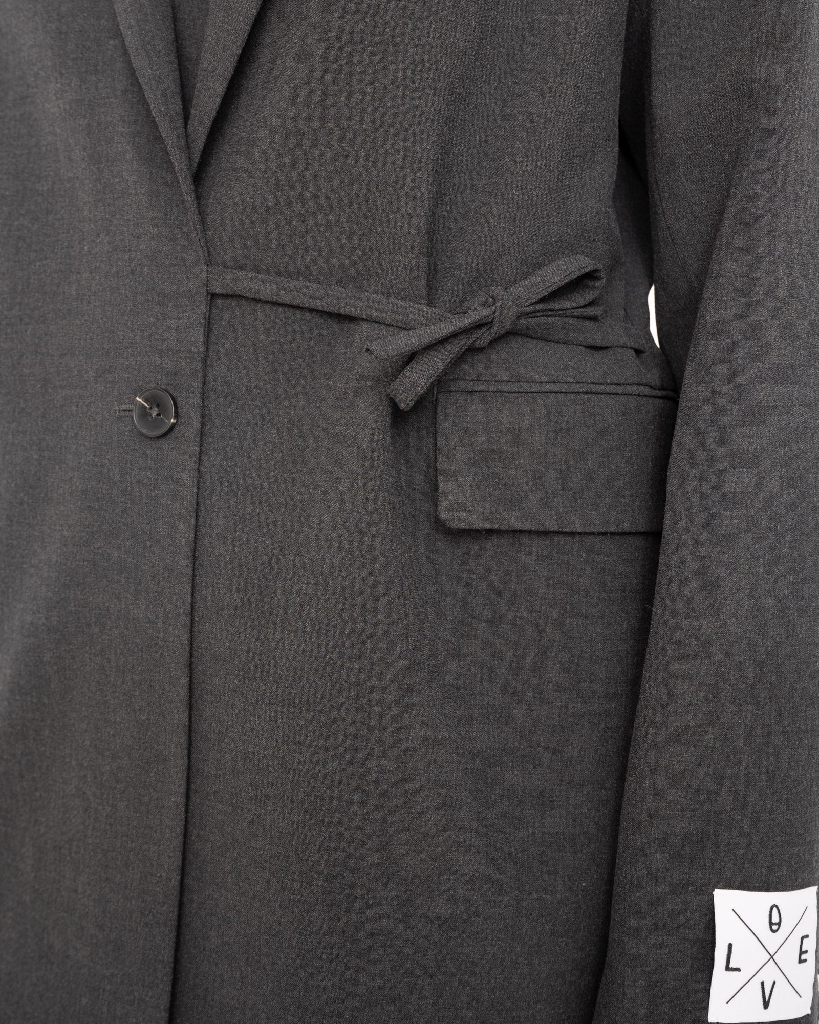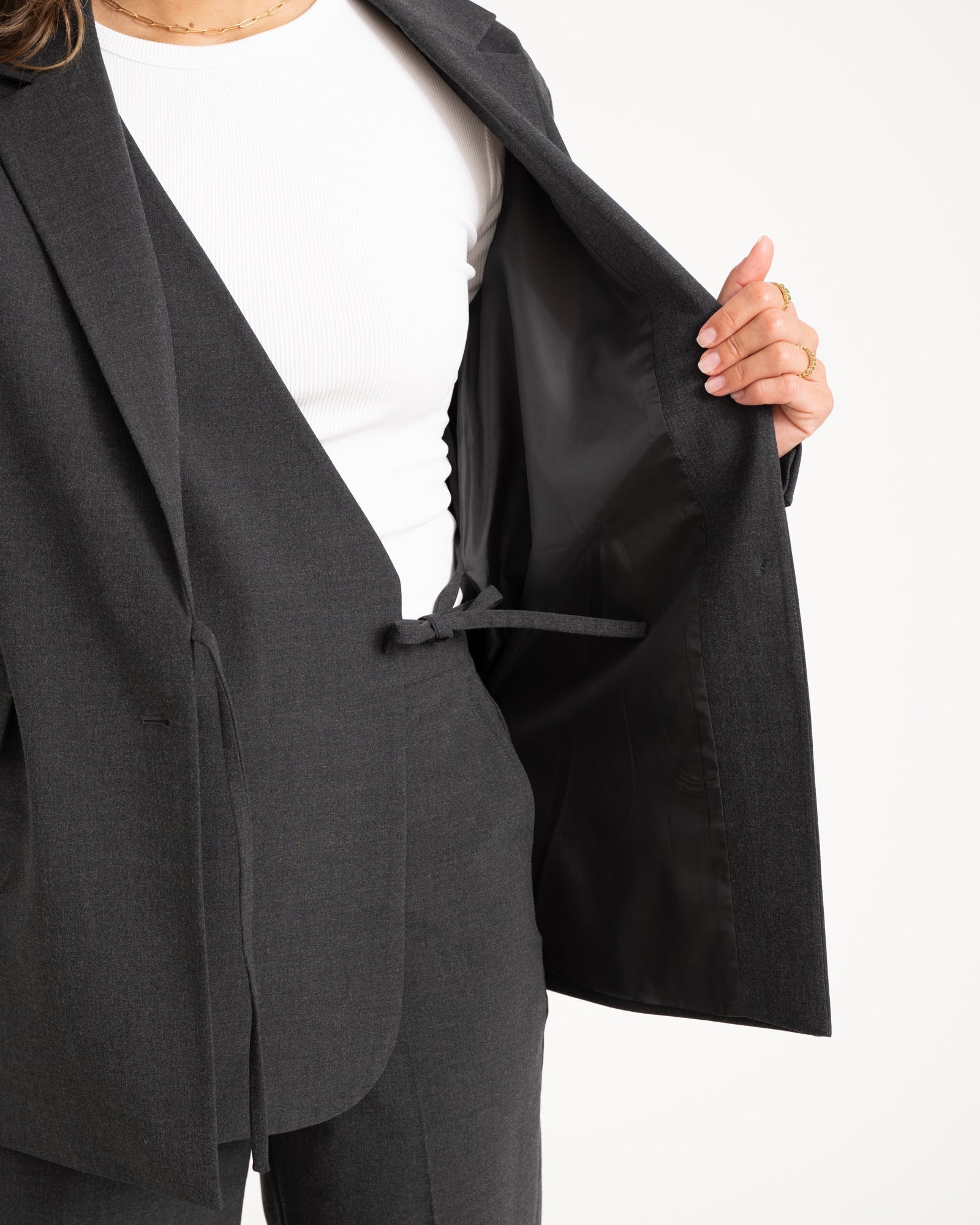 Net even anders dan je standaard blazer! Deze donkergrijze blazer heeft een knoop- én striksluiting voor een speelse twist. Valt op maat en is makkelijk te stylen – van casual tot office chic.