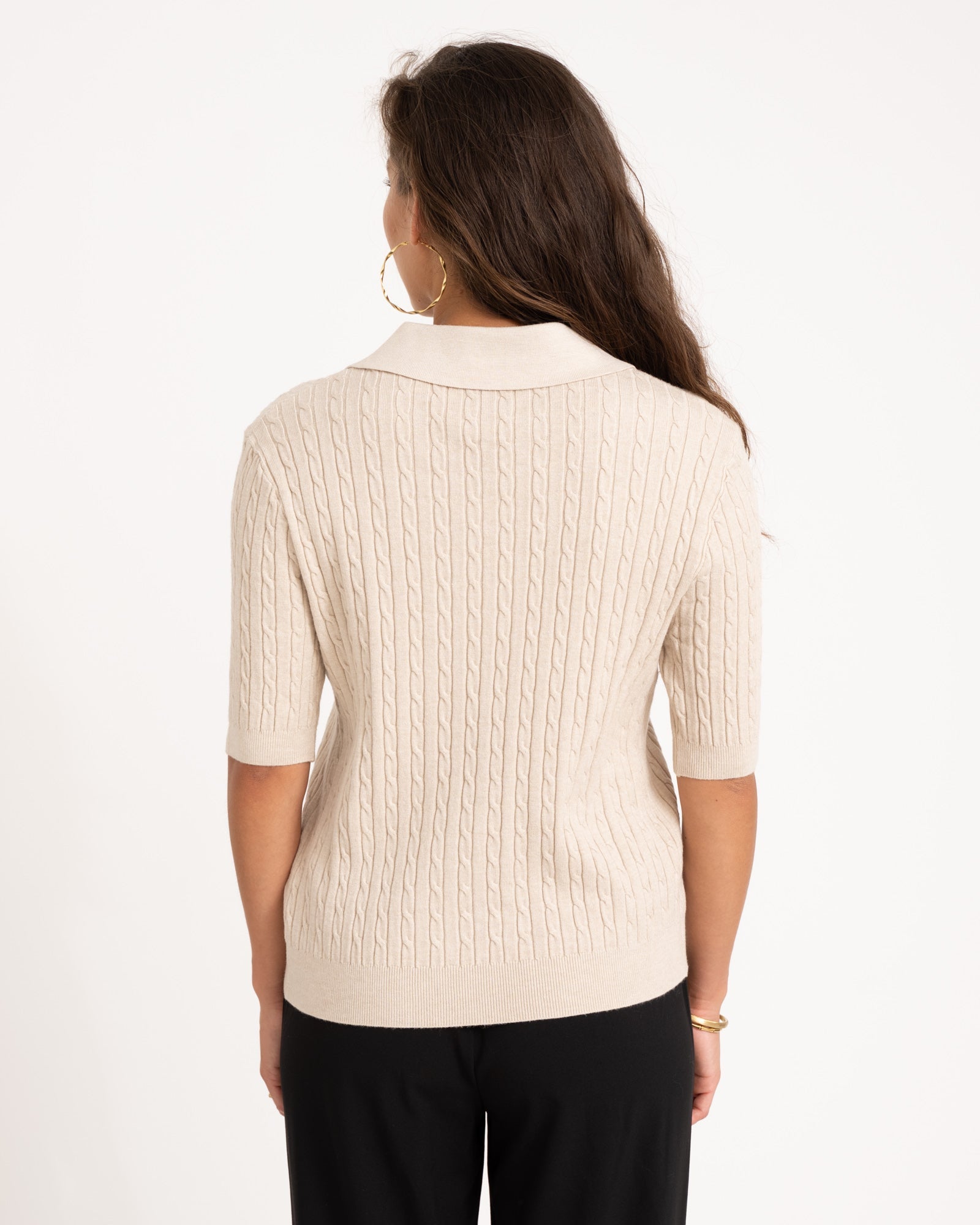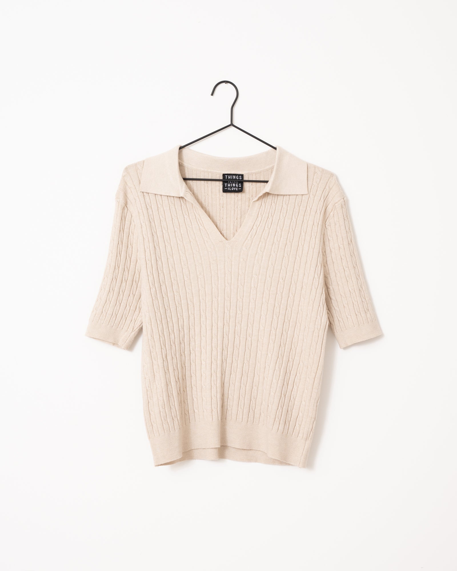 Zachte gebreide top in beige met halflange mouwen, V-hals en een klassieke polokraag. De fijne kabelstructuur geeft ‘m een speels effect. Perfect voor een casual, maar stijlvolle look!