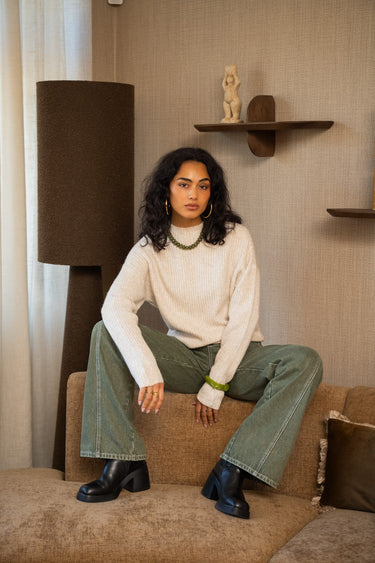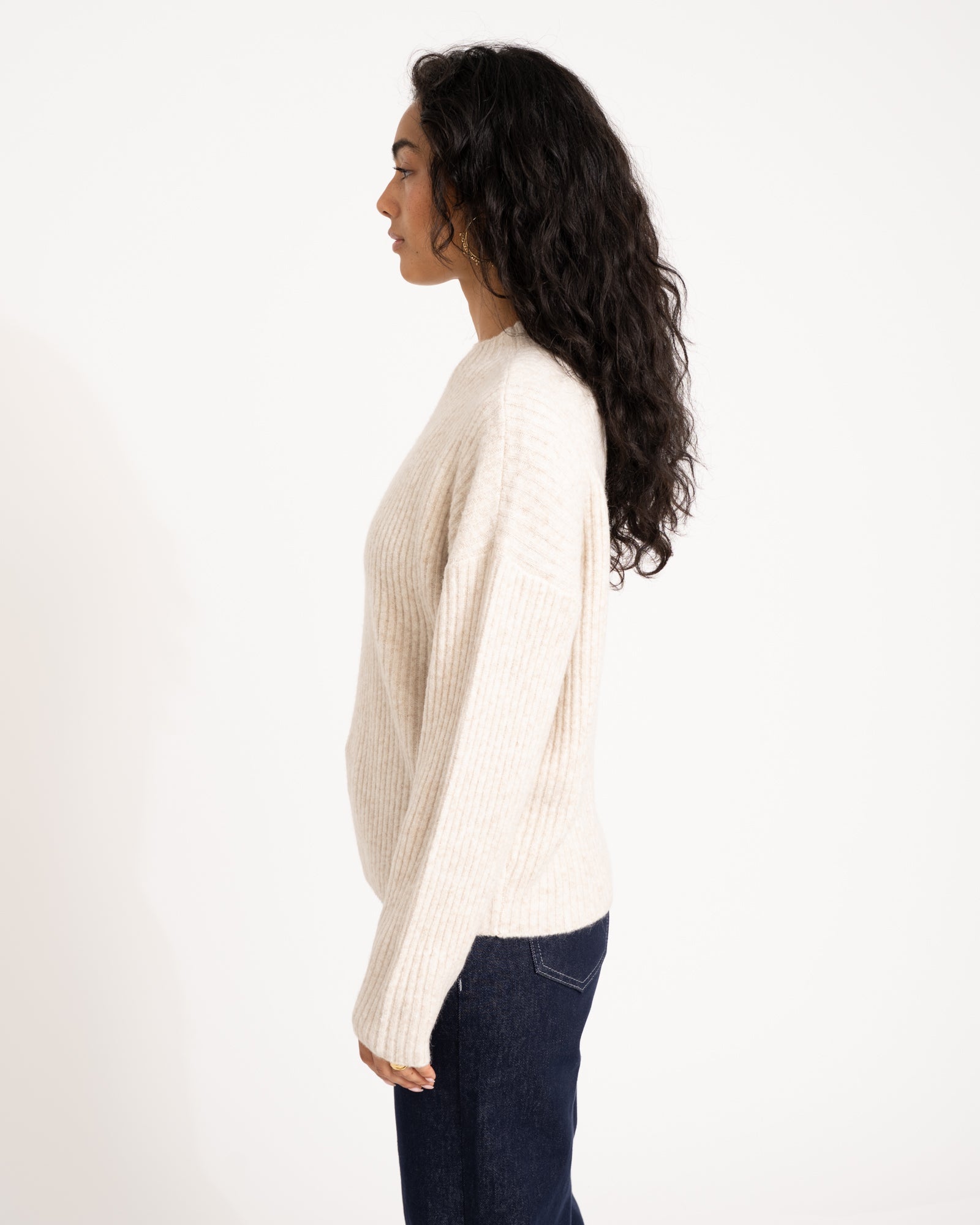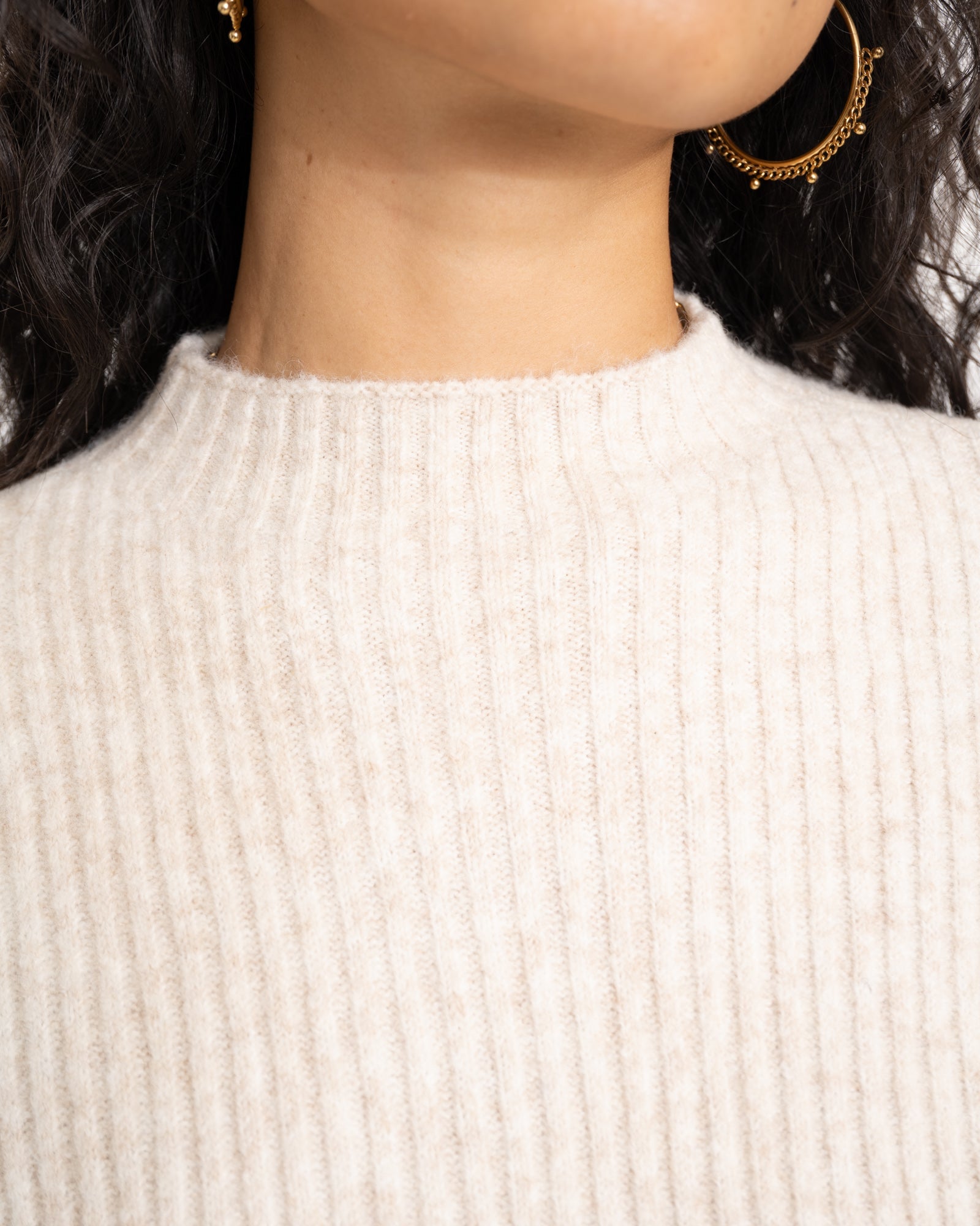 Zacht & oversized! Deze zandkleurige, dun gebreide trui met hoge hals past moeiteloos bij elke look.