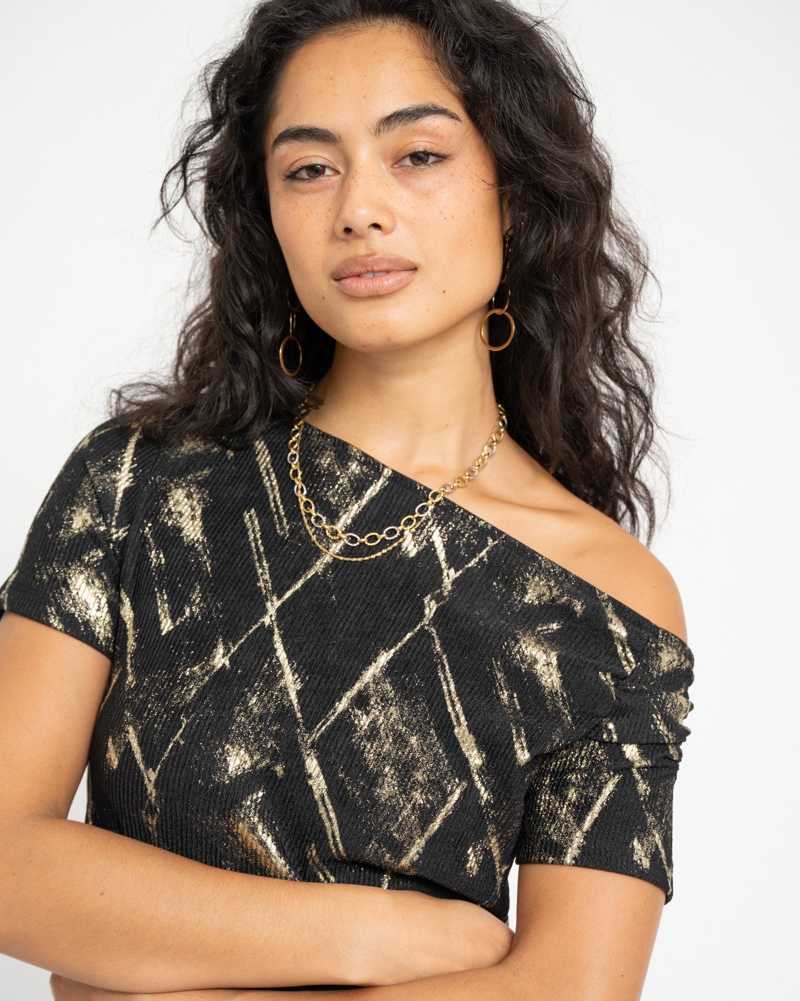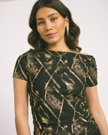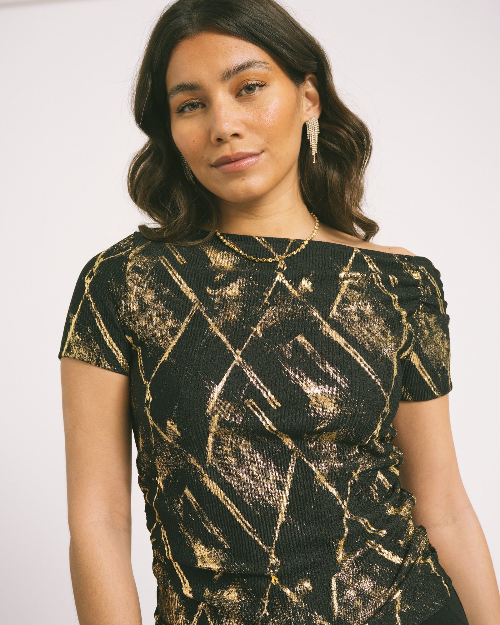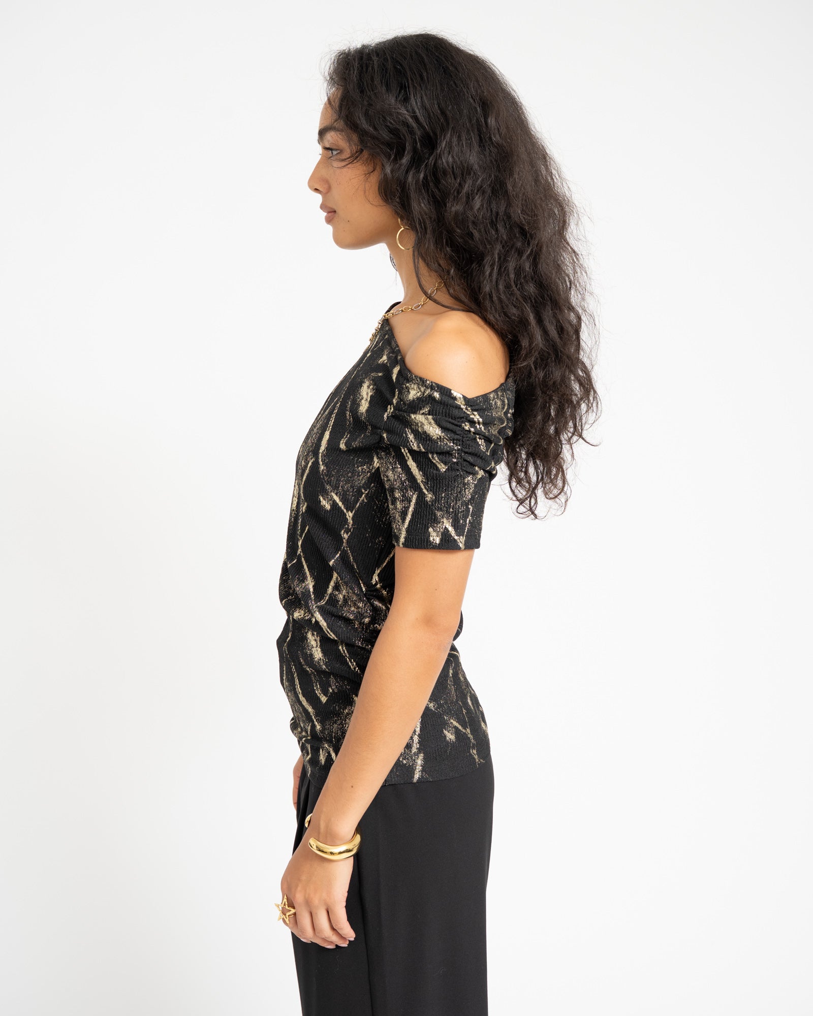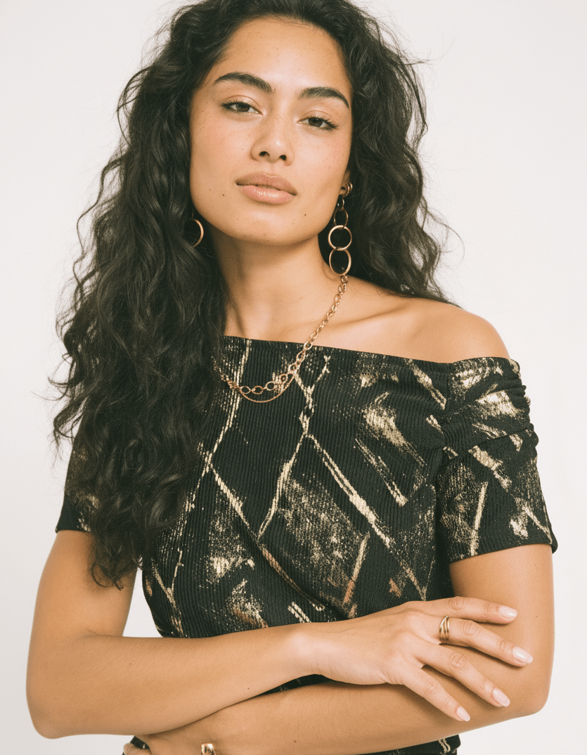 De Roya Off Shoulder is speels en verleidelijk tegelijk, met ruches langs de zijkant en in de mouwtjes die haar een unieke twist geven. Het off-shoulder design zorgt voor een romantische look, terwijl de strakke fit haar edgy en party proof maakt.