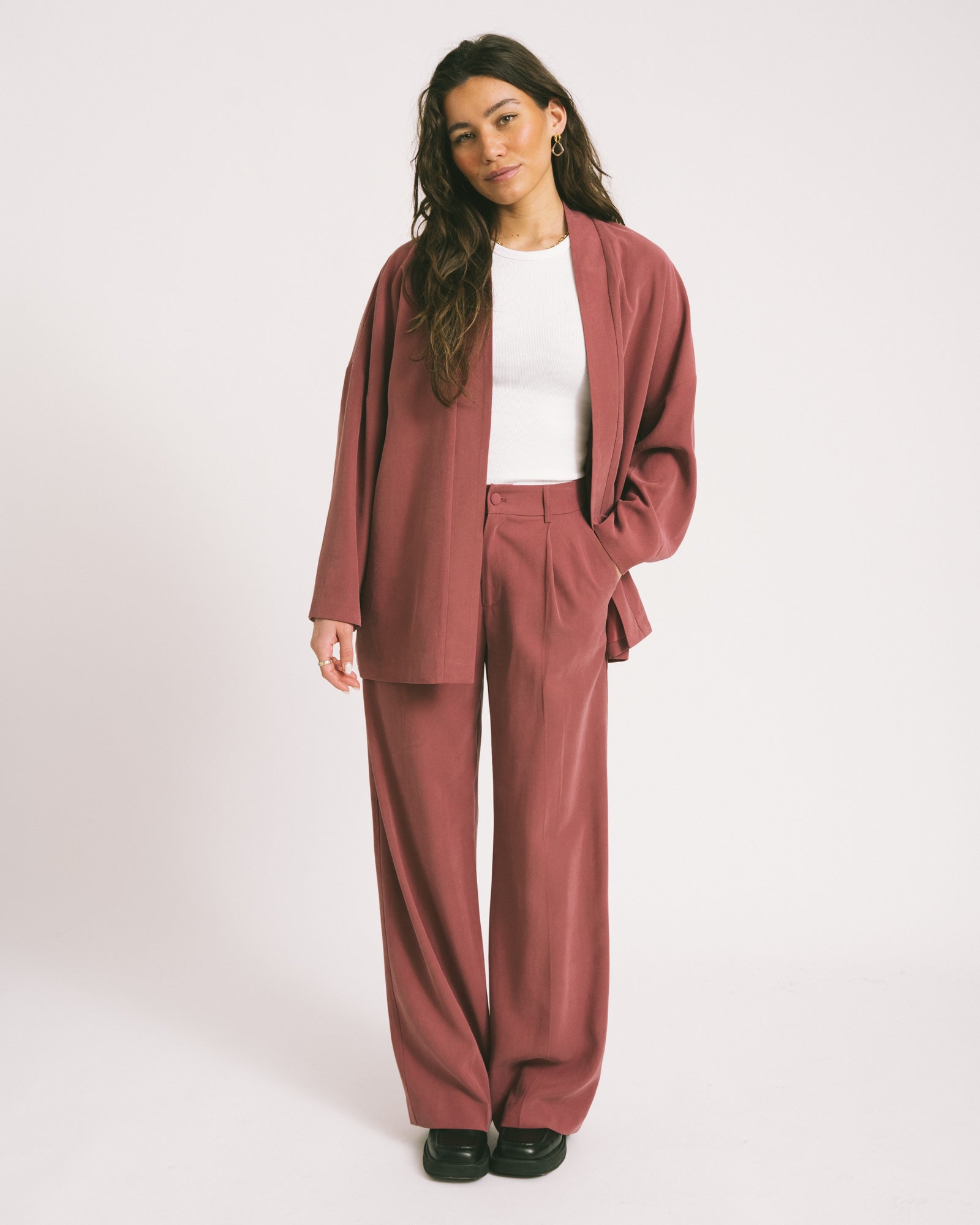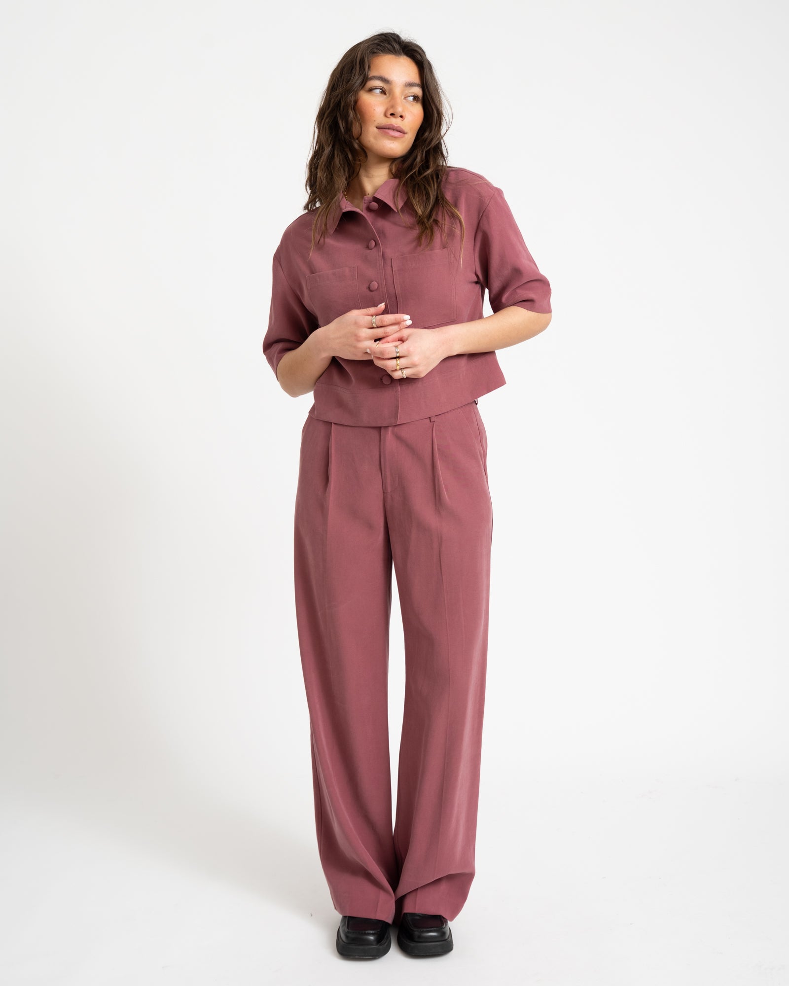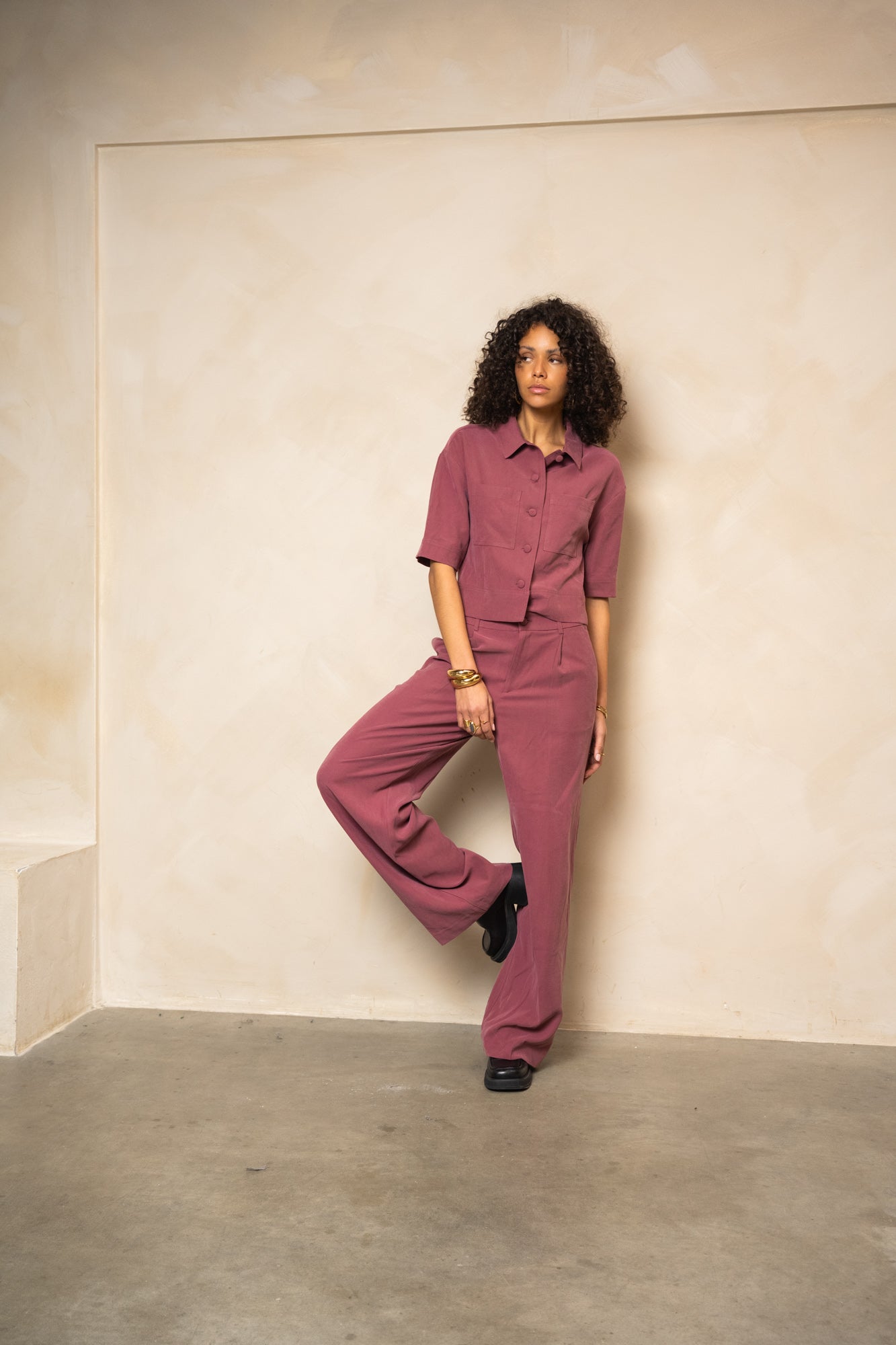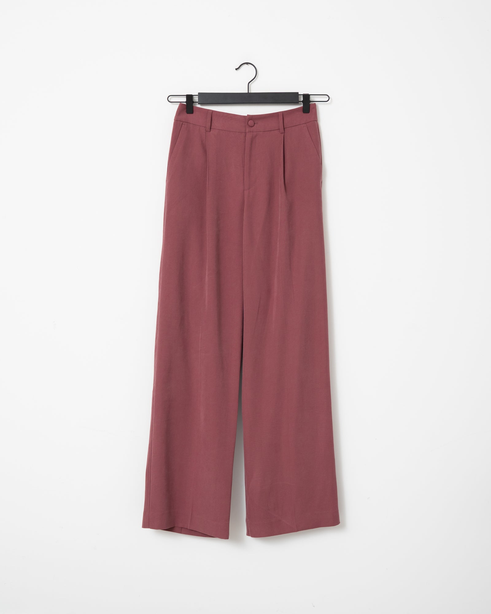 Stijlvolle pantalon in een diepe paarse tint met een hoge taille en rechte, wijde pijpen. De soepele stof zorgt voor een elegante en krachtige uitstraling.