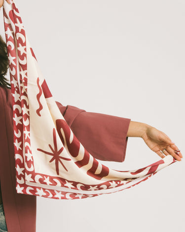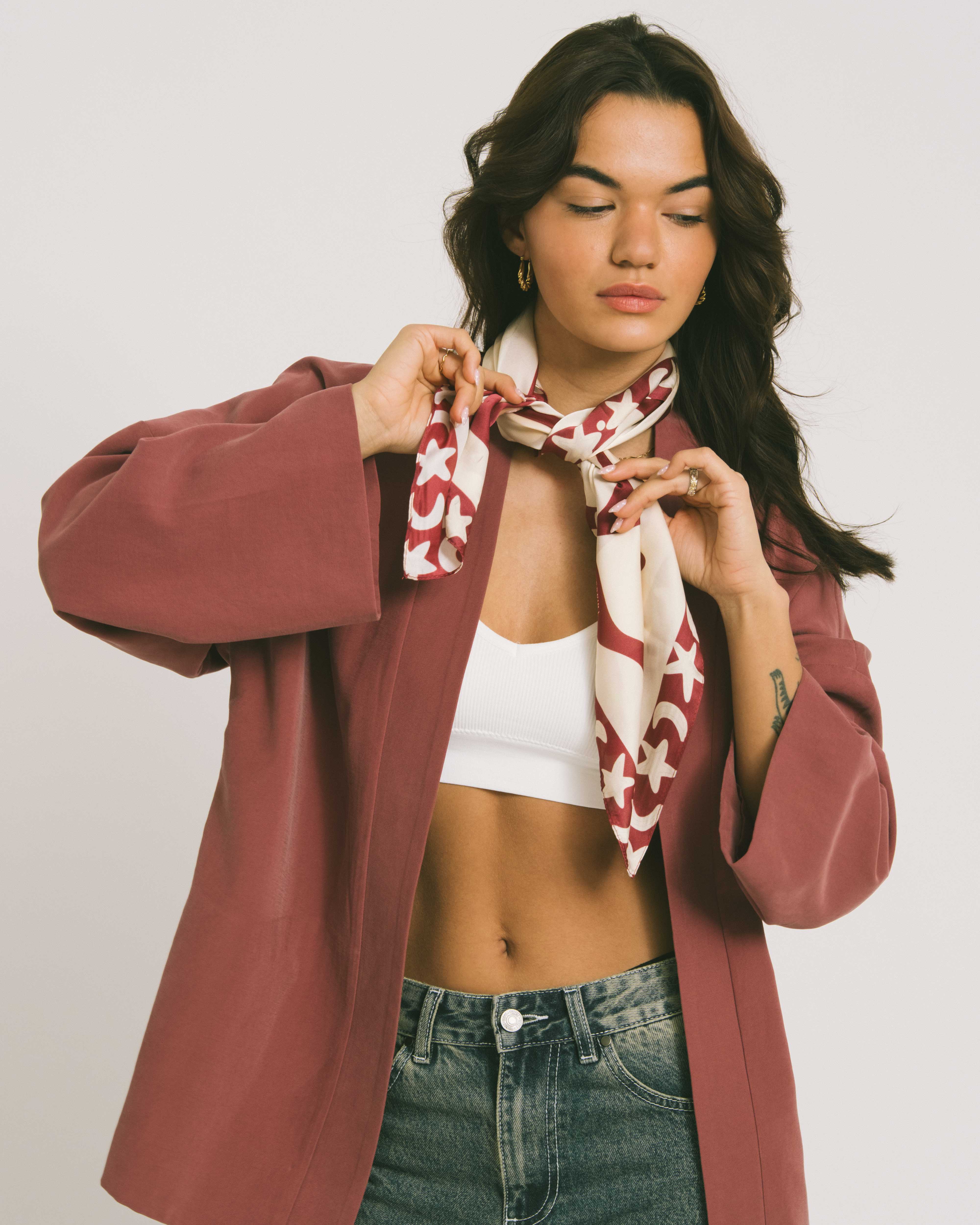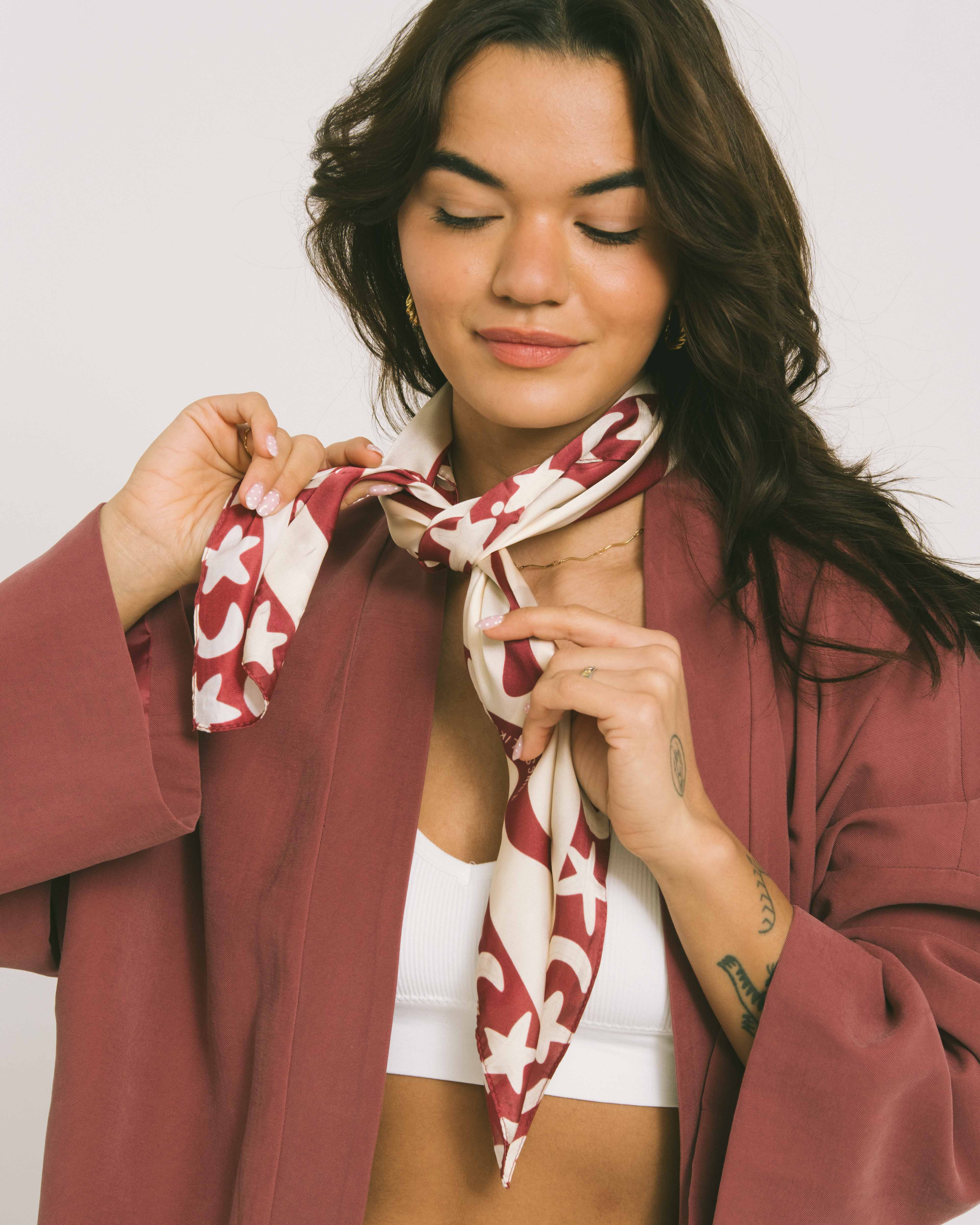 Zacht satijnen sjaaltje met een grafische print. Draag ’m in je haar, om je hals, om je middel of aan je tas voor een speels accent. 🤍