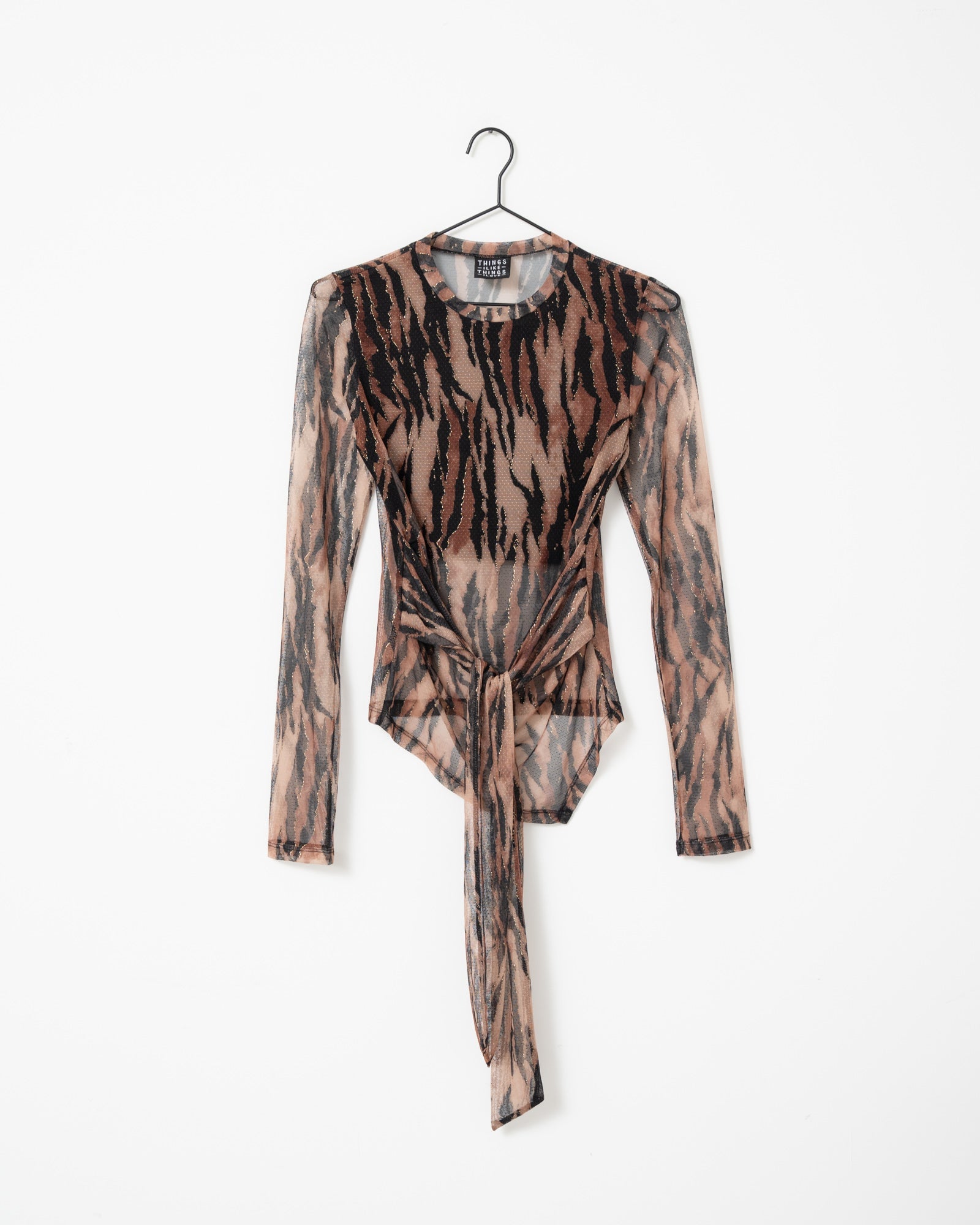 De Sera top komt in een tiger print mesh en valt op door haar speelse details. De asymmetrische onderkant en de brede straps in dezelfde stof kun je knopen aan de voor- of achterkant. Draag hem zoals jij wilt.