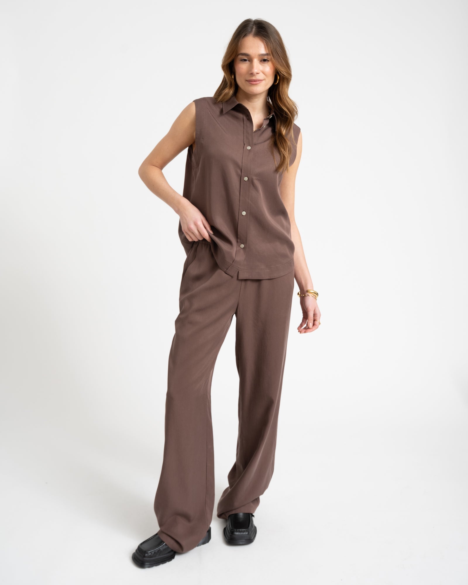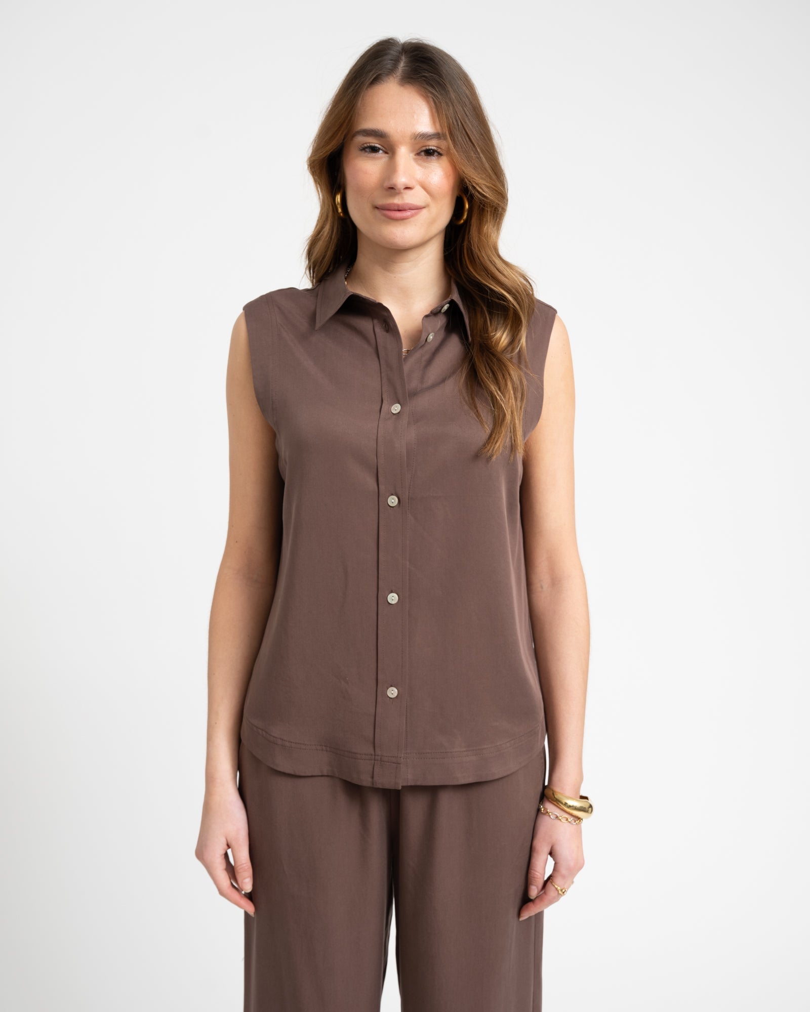 Luchtige blouse in een warme bruine tint met een mouwloos design en klassieke kraag. De knoopsluiting aan de voorkant zorgt voor een stijlvolle, tijdloze uitstraling. Mooi te dragen als set of los gecombineerd.