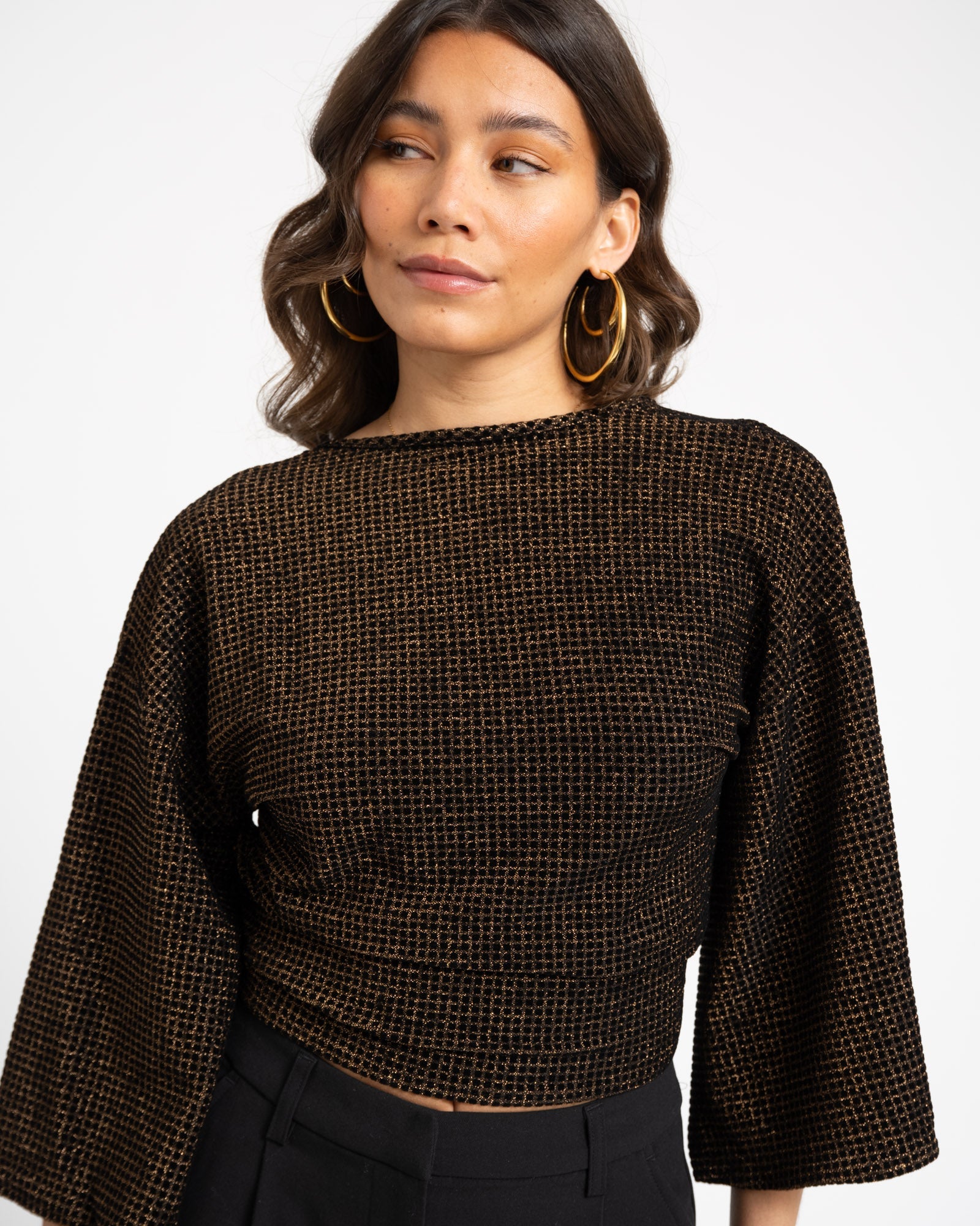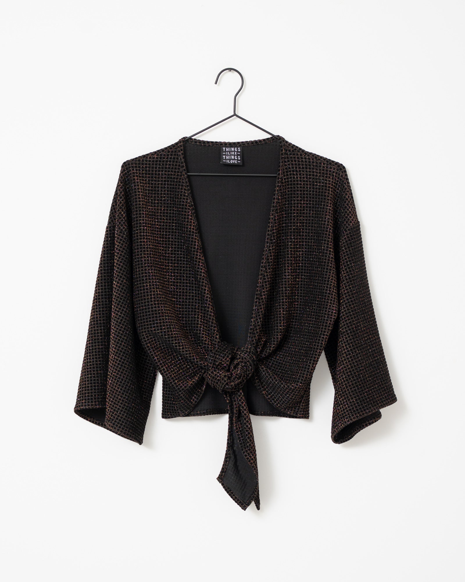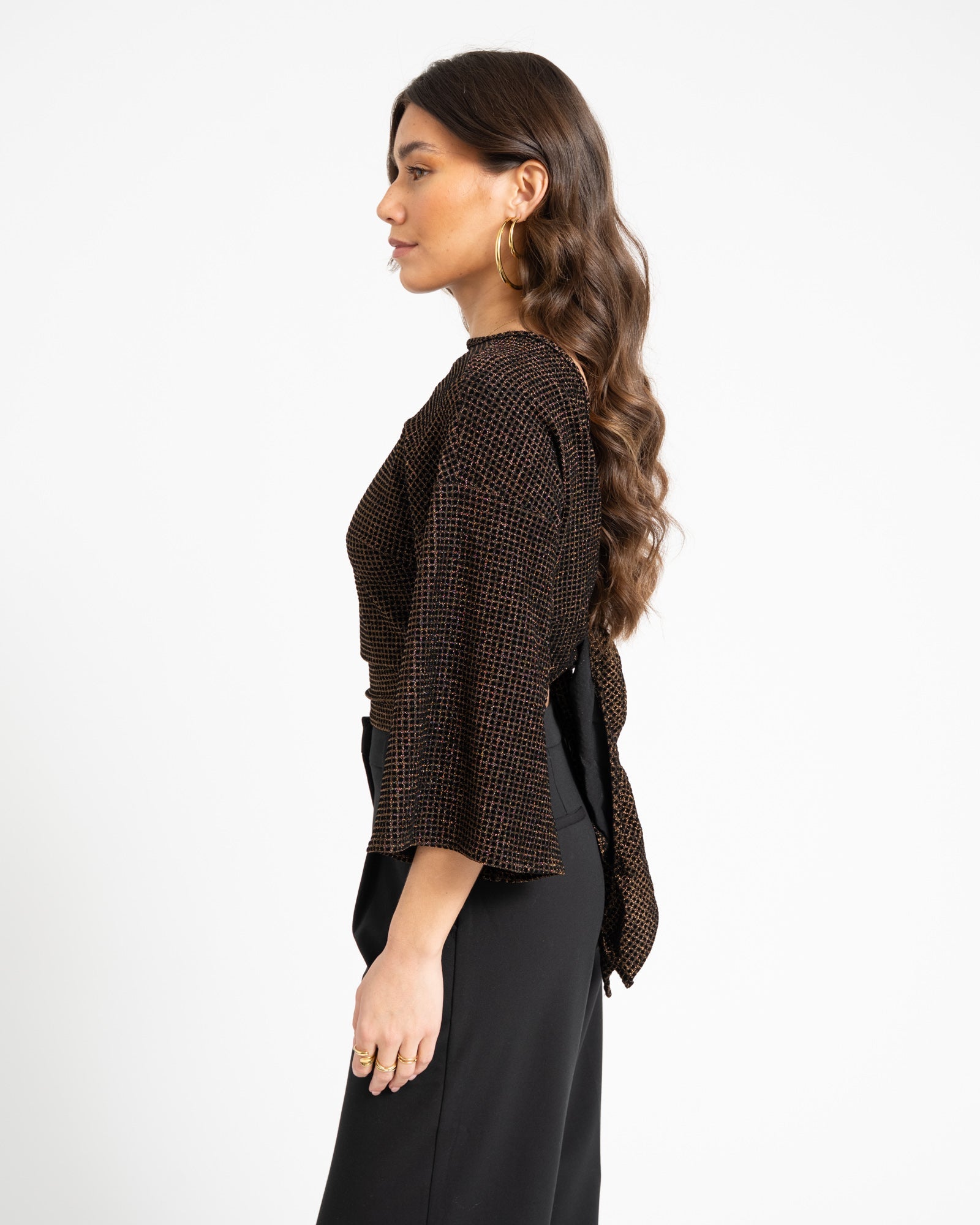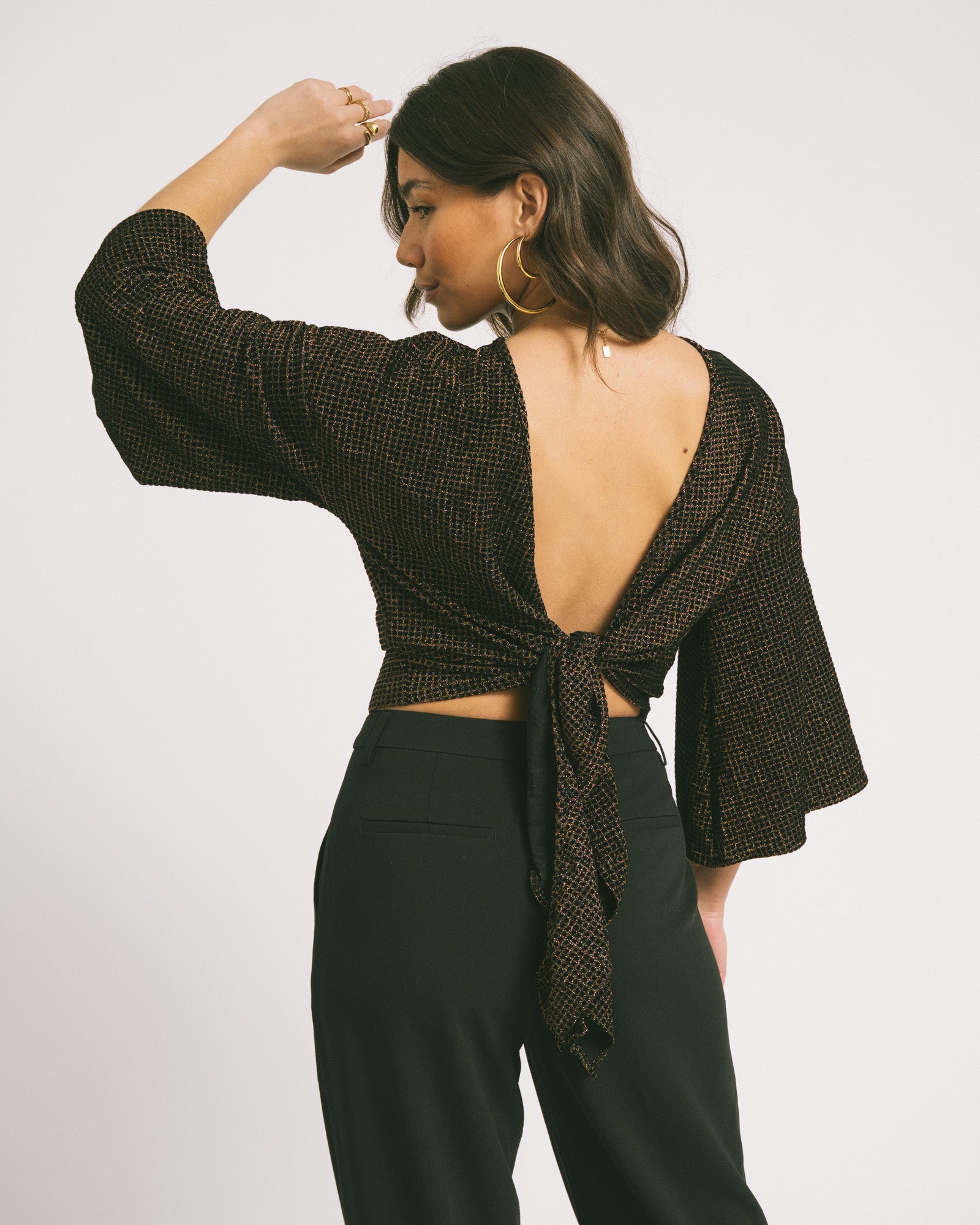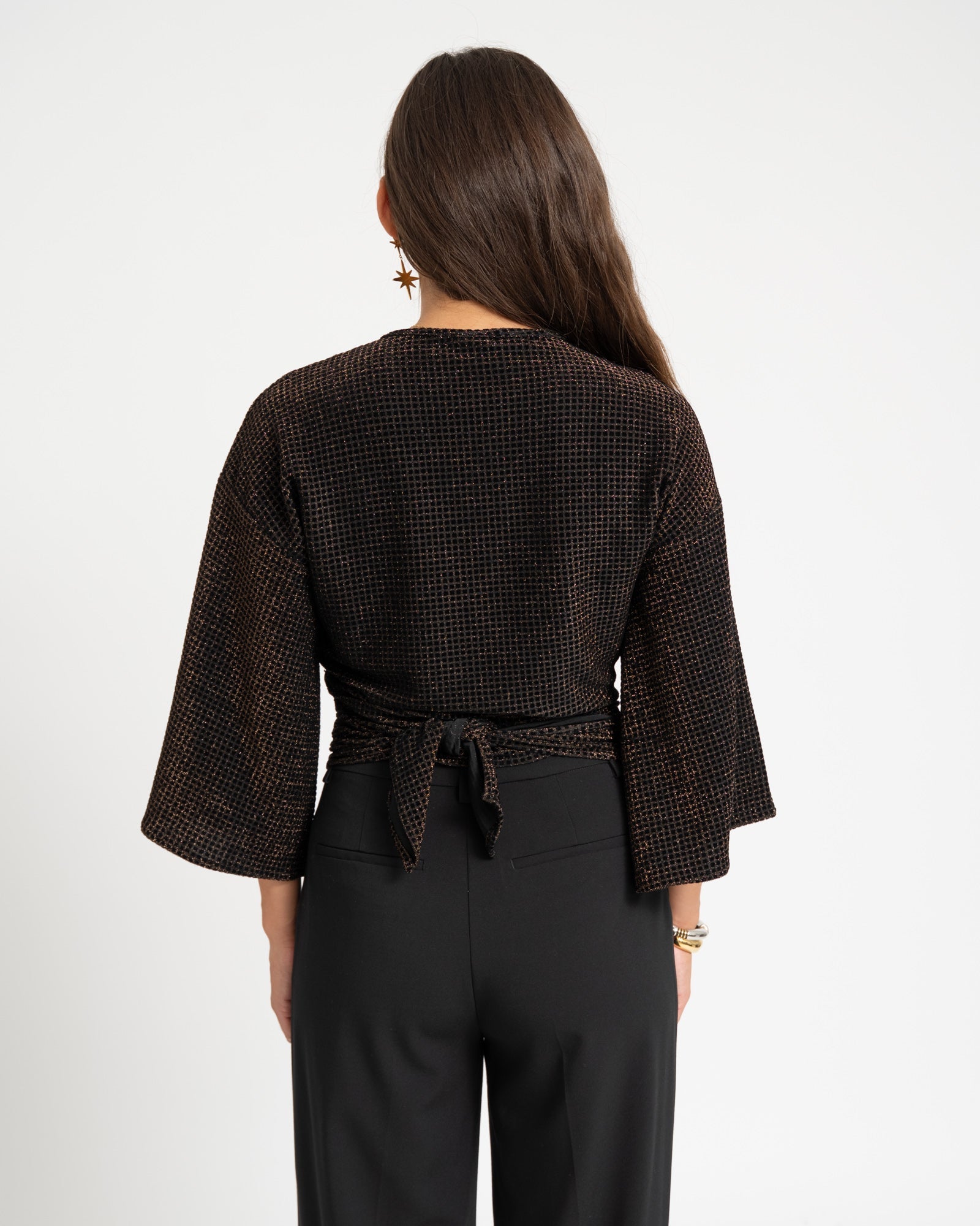Deze wraptop komt in een checkered print en heeft speelse flare mouwen. Je kunt haar op twee manieren dragen: knoop ’m aan de voorkant voor een kortere, speelse fit of draag de strik aan de achterkant voor een iets bedektere look. Hoe je haar ook styled, met Sunny ben je altijd ready to shine.