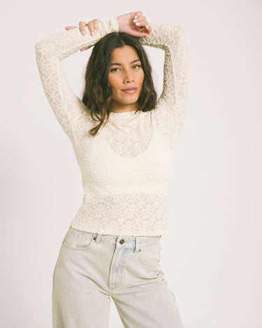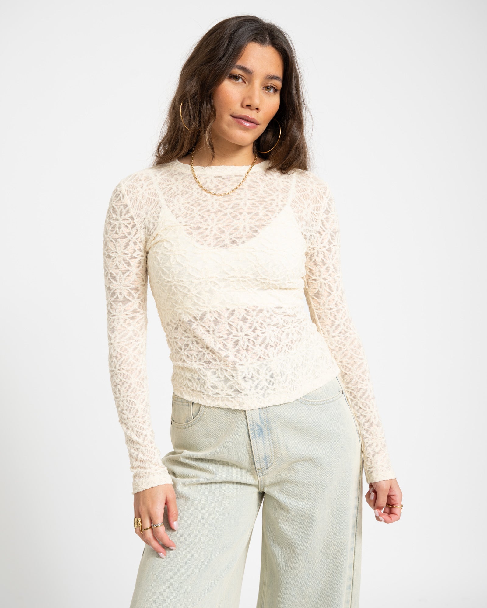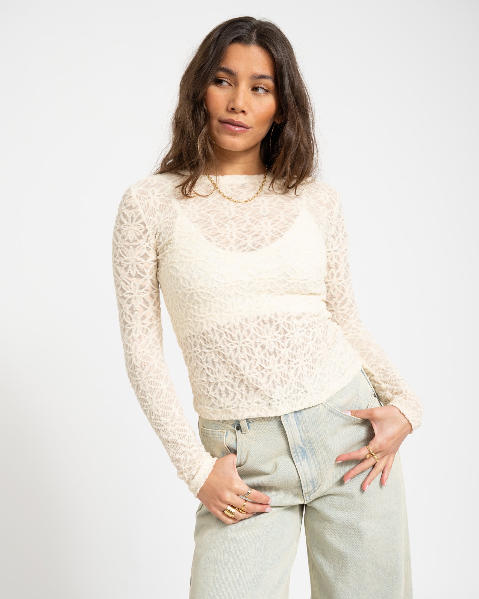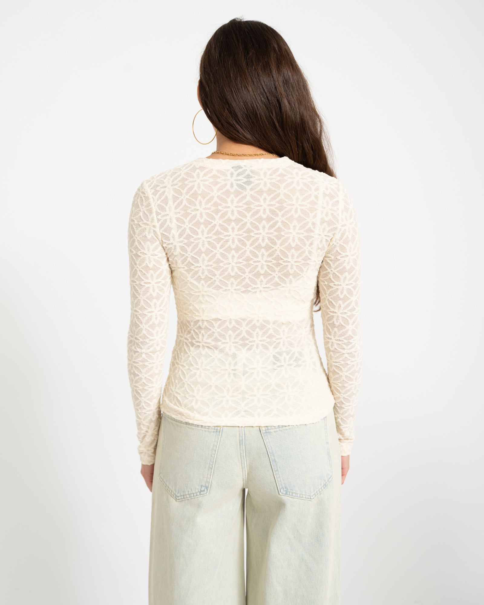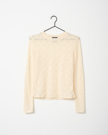Zachte mesh longsleeve in een lichte gele tint met verfijnd all-over patroon. De aangesloten fit en transparante stof geven een vrouwelijke en elegante uitstraling. Mooi om te layeren of subtiel als statement te dragen. ✨