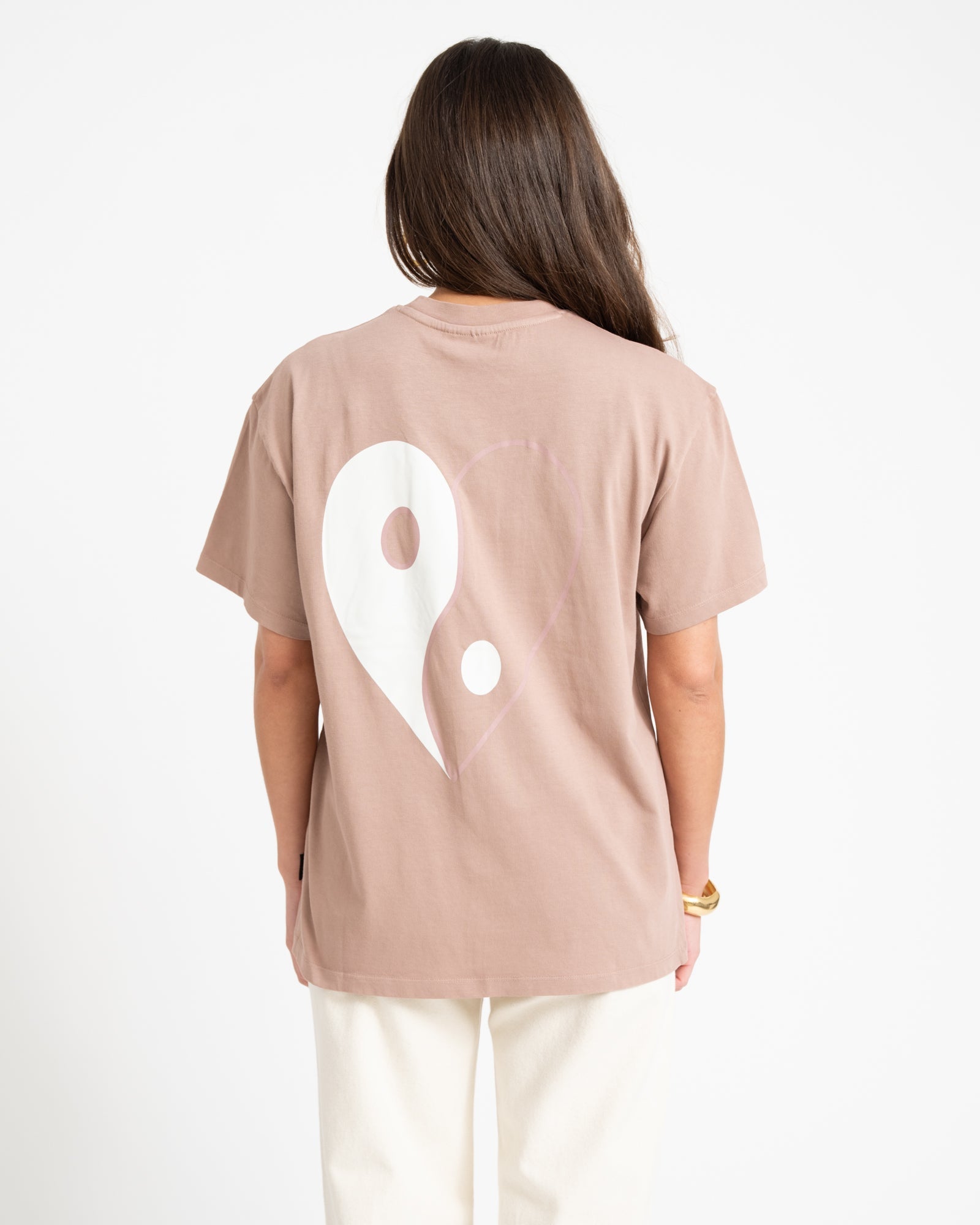 Balance meets love. Deze oversized tee is de perfecte mix van comfy en cool. Van voren clean en minimal, van achter een groot yin yang-heart statement.