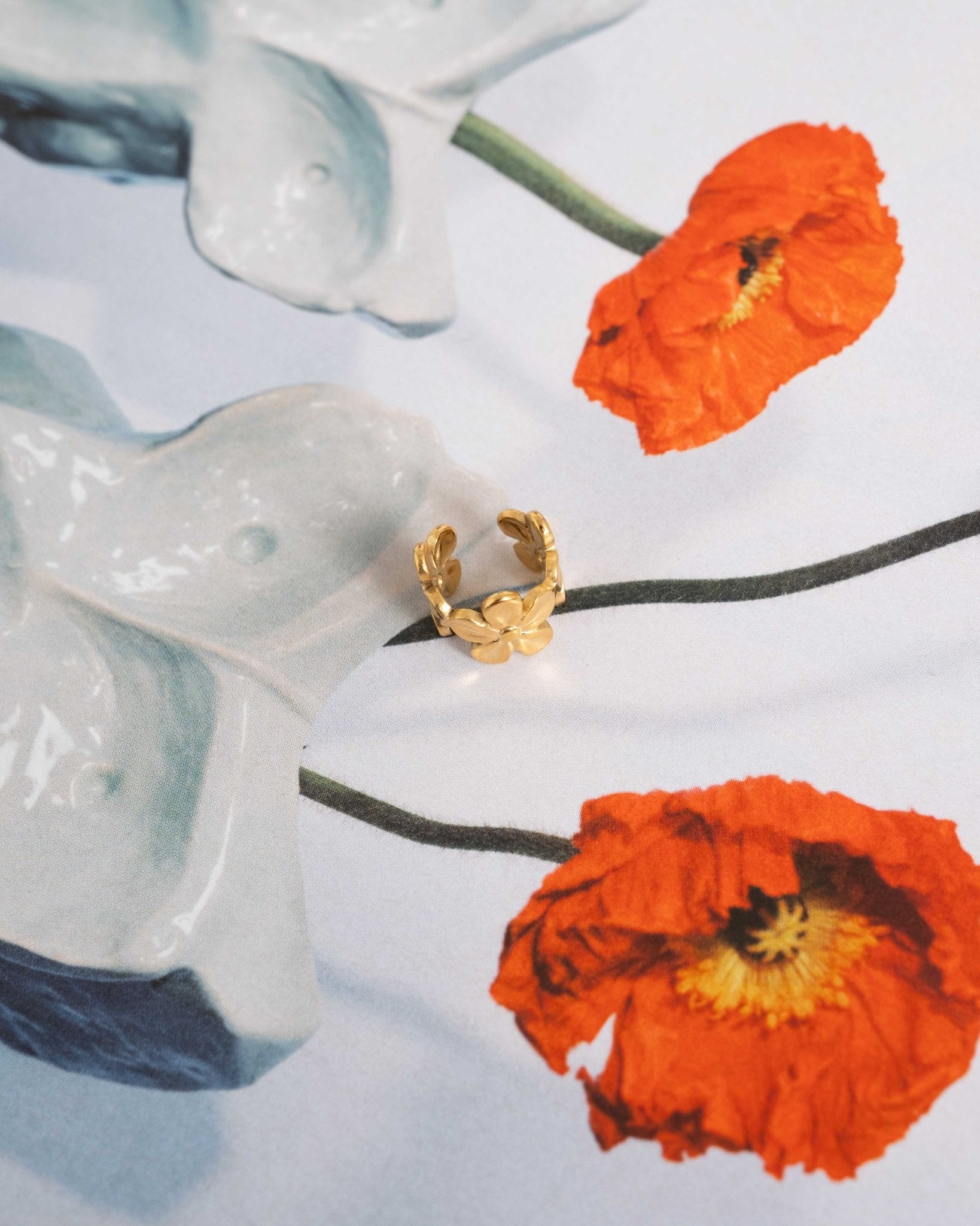 Subtiele goudkleurige ear cuff met een verfijnd bloemetjesdesign. De perfecte toevoeging voor een speelse en elegante touch aan je earparty en je hebt er geen gaatje voor nodig.