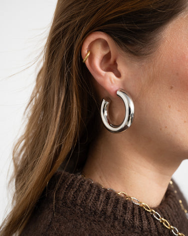 Stijlvolle zilverkleurige oorringen met een zachte, ronde vorm die overal bij passen. Subtiel, chic en perfect om elke dag te dragen, een echte favoriet voor je sieradencollectie.