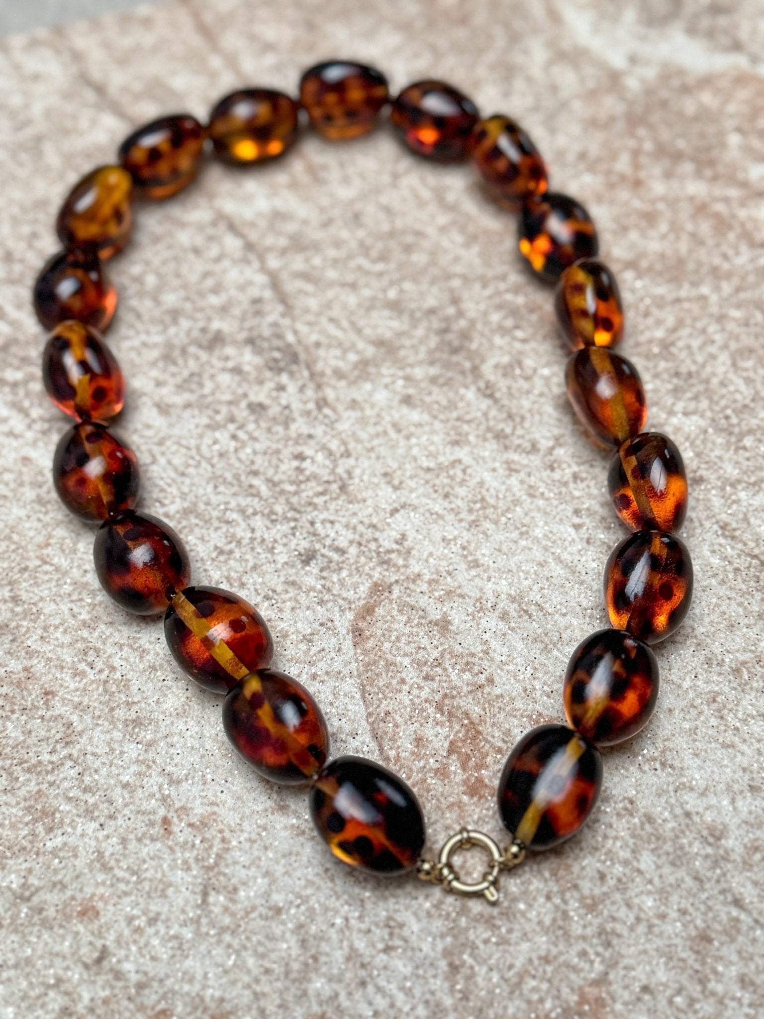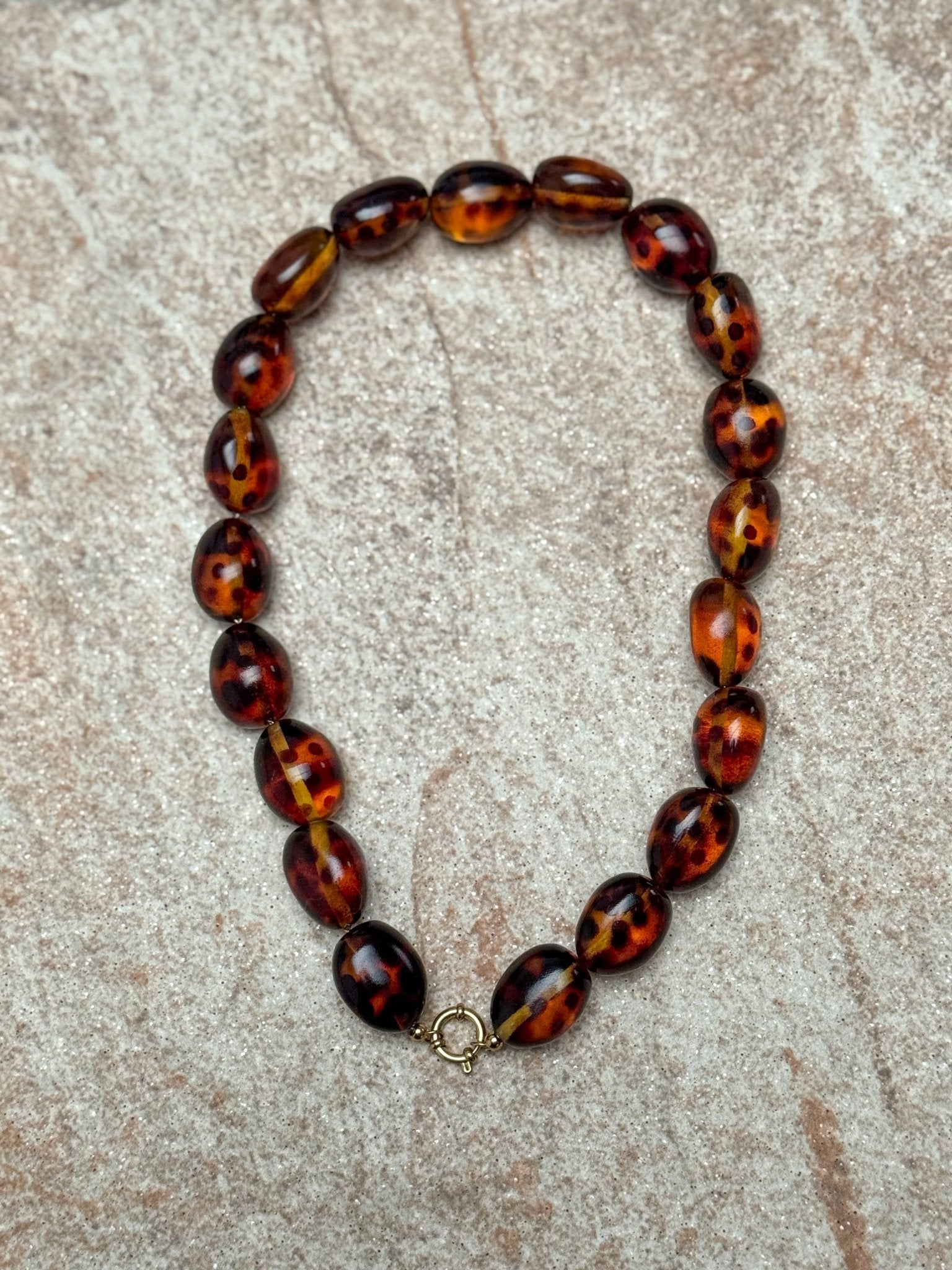Grove kralen ketting met luipaard print en gouden sluiting.