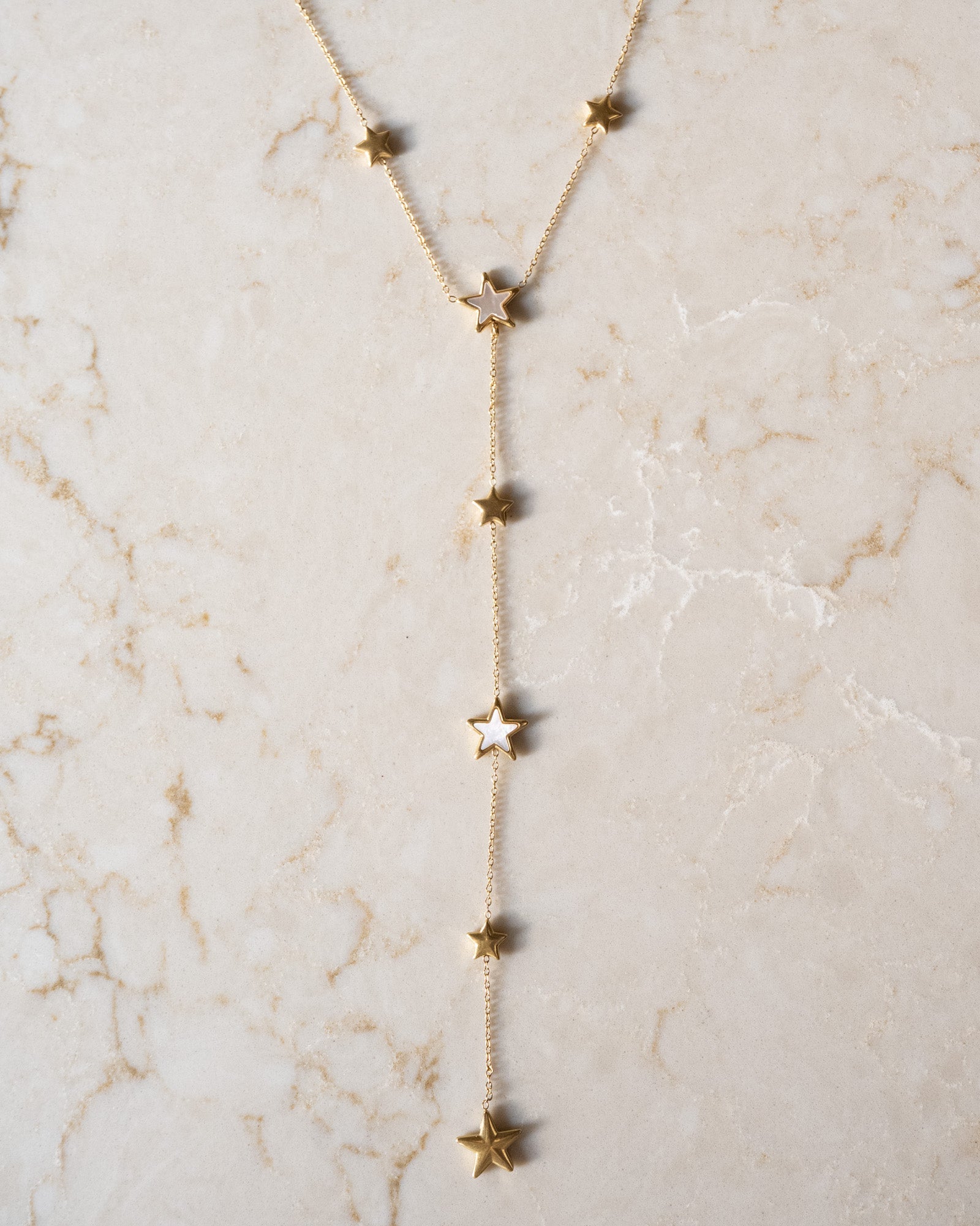 Een verfijnde gouden ketting met meerdere stervormige hangers met parelmoer detail, die in een verticale lijn langs het decolleté vallen.